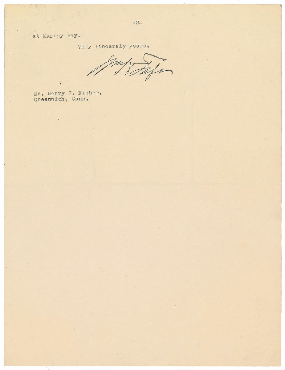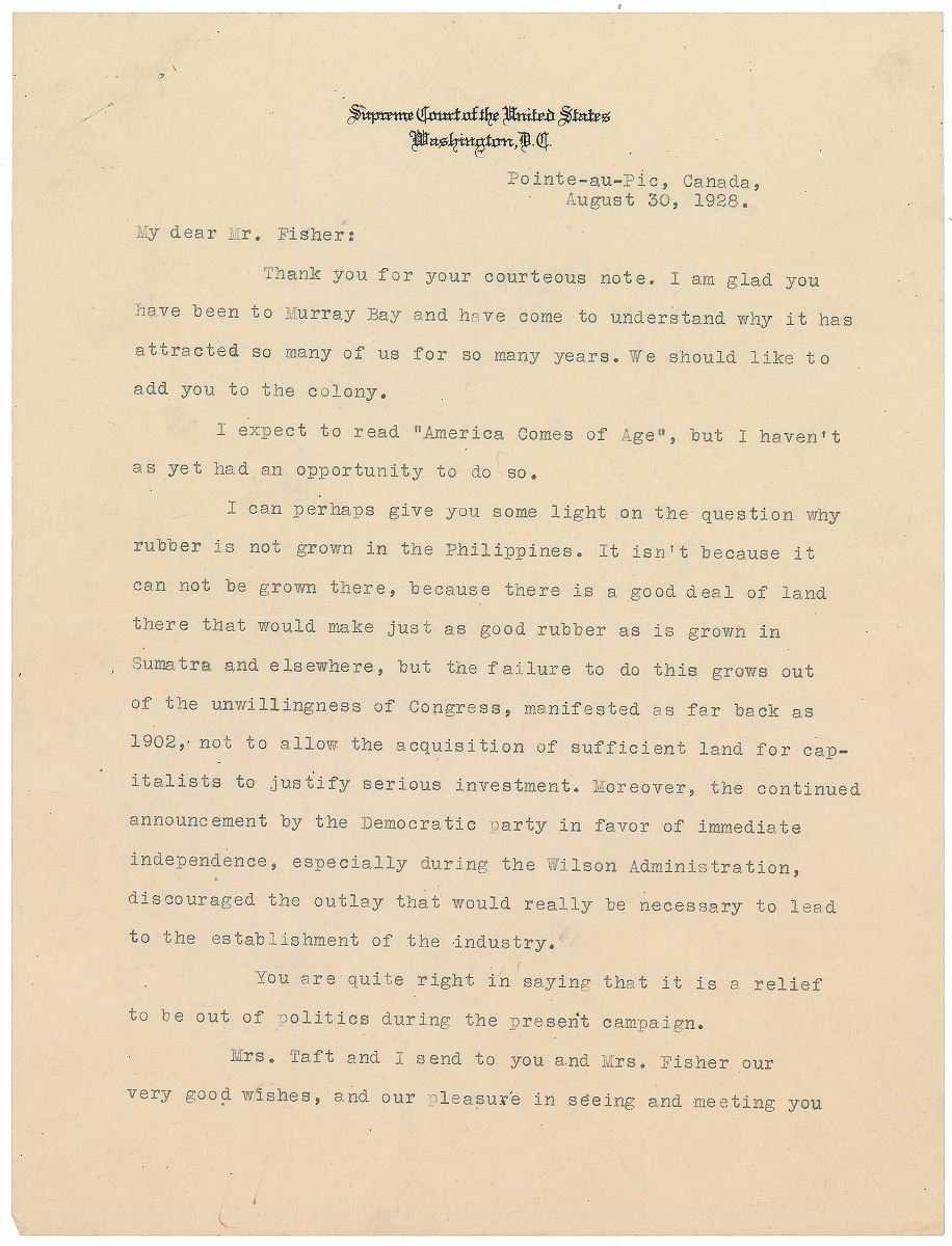 TLS signed “Wm. H. Taft,” two pages, 8 x 10.5, Supreme Court of the United States letterhead, August 30, 1928. Letter to Harry J. Fisher, in part: “I can perhaps give you some light on the question why rubber is not grown in the Philippines. It isn’t because it can not be grown there, because there is a good deal of land there that would make just as good rubber as is grown in Sumatra and elsewhere, but the failure to do this grows out of the unwillingness of Congress, manifested as far back as 1902, not to allow the acquisition of sufficient land for capitalists to justify serious investment…You are quite right in saying that it is a relief to be out of politics during the present campaign.” In fine condition, with staple holes to upper left corner.