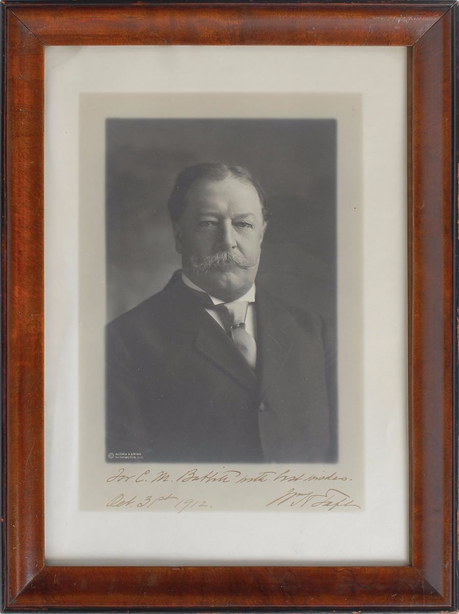 Striking matte-finish 9.5 x 13.5 portrait of Taft by Harris & Ewing, signed and inscribed in fountain pen as president, “For C. M. Babbitt with best wishes, Wm. H. Taft, Oct. 31st 1912.” Nicely framed and in fine condition.