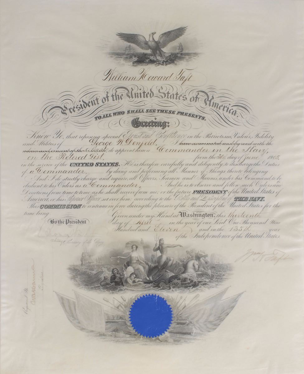 Partly-printed vellum DS as president, signed “Wm. H. Taft,” one page, 15.5 x 19.25, April 13, 1911. President Taft appoints George W. Denfeld as “a Commander in the Navy, on the Retired List.” Signed at the conclusion by President Taft and countersigned by Acting Secretary of the Navy Beekman Winthrop. The blue seal affixed at the bottom remains intact with a small tear. In fine condition.