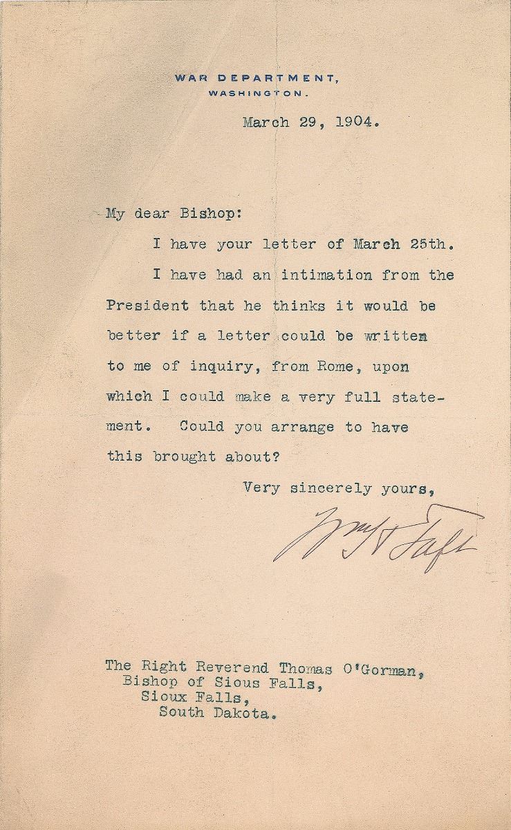 TLS signed “Wm. H. Taft,” one page, 5.5 x 9, War Department letterhead, March 29, 1904. Letter to the Right Reverend Thomas O’Gorman, bishop of Sioux Falls, South Dakota. In part: “I have had an intimation from the President that he thinks it would be better if a letter could be written to me of inquiry, from Rome, upon which I could make a very full statement. Could you arrange to have this brought about?” In fine condition, with a diagonal crease and light soiling to upper left.