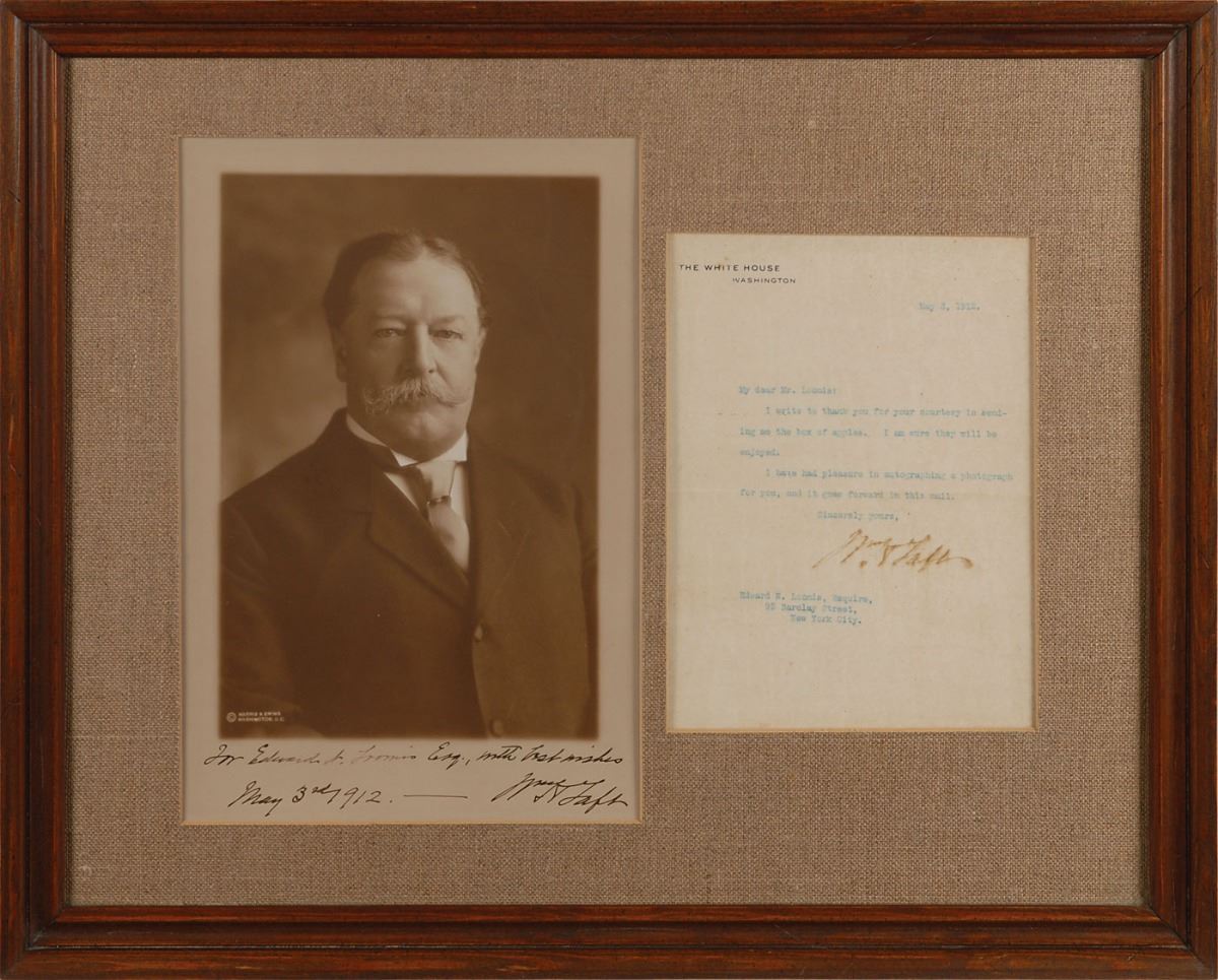 Two items: a handsome matte-finish 7.25 x 10.75 Harris & Ewing portrait of Taft, signed and inscribed in the lower border in ink as president, “For Edward N. Loomis Esq., with best wishes—Wm. H. Taft, May 3rd 1912”; and a TLS as president, signed “Wm. H. Taft,” one page, White House letterhead, May 3, 1912, transmitting the photo, in part: “Thank you for your courtesy in sending the box of apples. I am sure they will be enjoyed. I have had the pleasure in autographing a photograph for you, and it goes forward in this mail.” Matted and framed side-by-side to an overall size of 19.5 x 15.5. In overall very good to fine condition, with overall foxing to the letter and spreading to the letter’s signature.