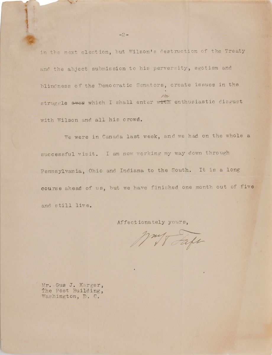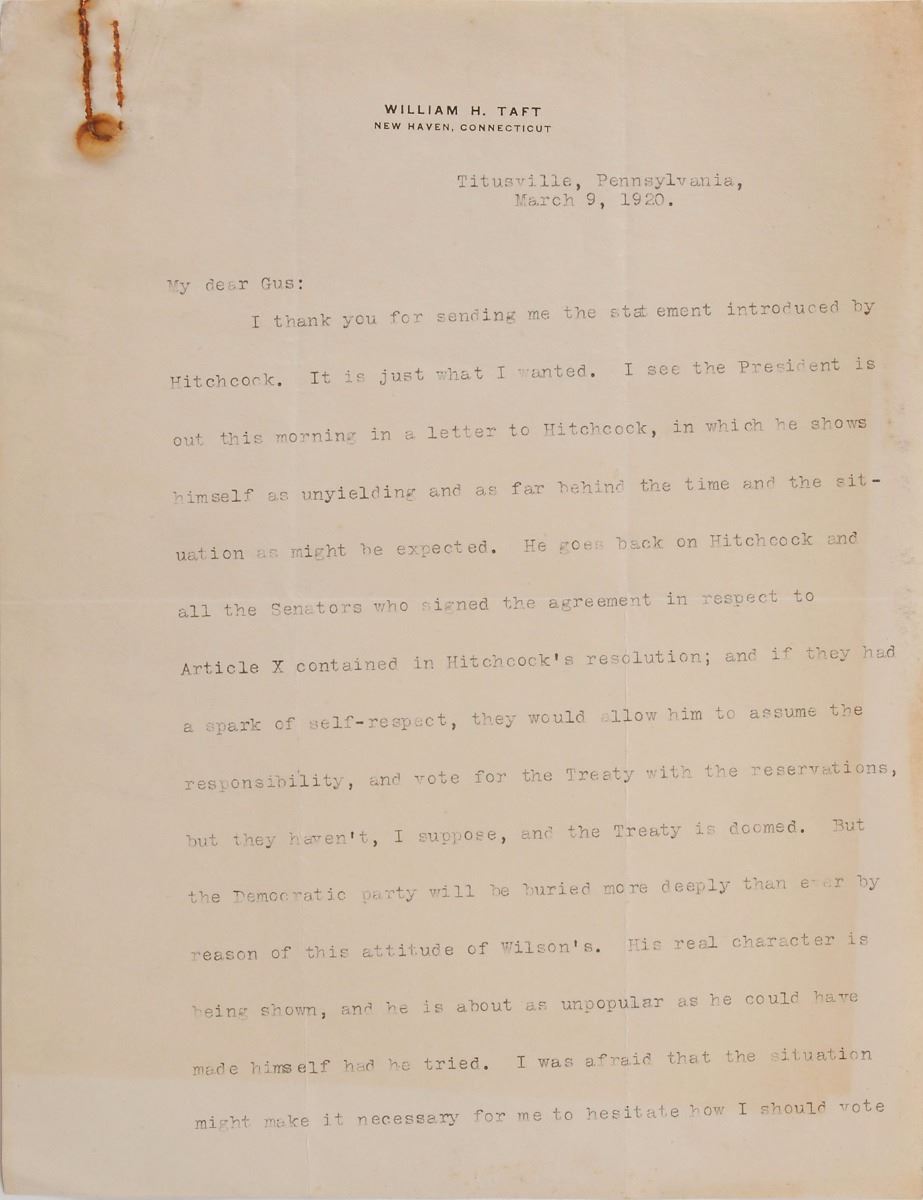 TLS signed “Wm. H. Taft,” two pages, 8 x 10.5, personal letterhead, March 9, 1920. Letter to newspaper correspondent Gus J. Karger concerning negotiations over the League of Nations, in part: “I see the President is out this morning in a letter to Hitchcock, in which he shows himself as unyielding and as far behind the time and the situation as might be expected. He goes back on Hitchcock and all the Senators who signed the agreement in respect to Article X contained in Hitchcock’s resolution; and if they had a spark of self-respect, they would allow him to assume the responsibility, and vote for the Treaty with the reservations, but they haven’t, I suppose, and the Treaty is doomed. But the Democratic party will be buried more deeply than ever by reason of this attitude of Wilson’s. His real character is being shown, and he is about as unpopular as he could have made himself if he tried.” In very good condition, with rusty paperclip impressions to top left corners, and areas of light irregular toning.