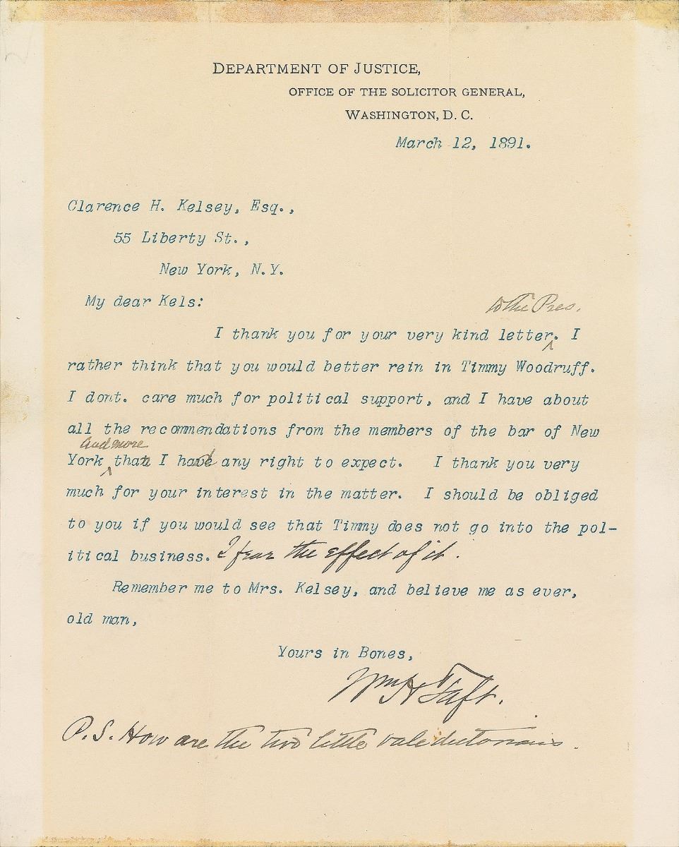 TLS signed “Wm. H. Taft,” one page, 8 x 10, Department of Justice letterhead, March 12, 1891. Letter to Clarence H. Kelsey, a lifelong friend and Yale classmate to Taft, concerning the political career of Timothy Lester Woodruff, a fellow Yale graduate and American businessman. In part: “I don’t care much for political support, and I have about all the recommendations from the members of the bar of New York and more than I had any right to expect…I should be obliged to you if you would see that Timmy does not go into the political business. I feat the effect of it.” In addition to several handwritten corrections, Taft adds a short postscript: “P.S. How are the two little valedictorians.” In very good to fine condition, with a light block of toning from prior display, and old tape remnants along the top and bottom edges.