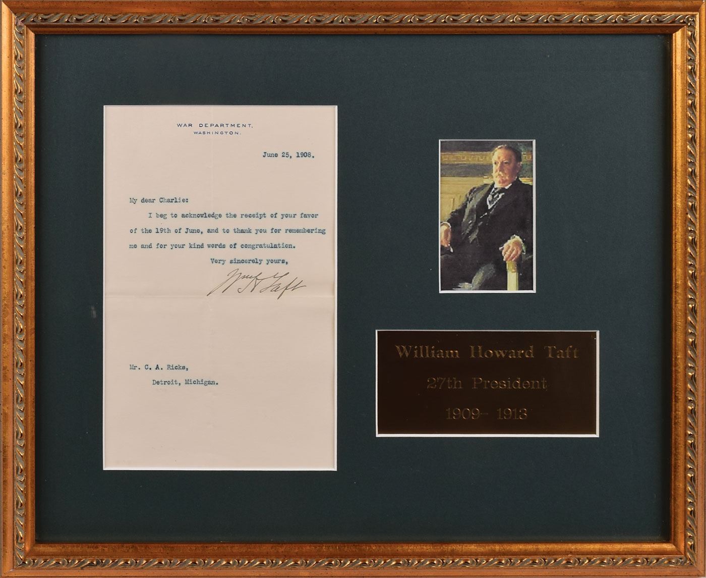 TLS signed “Wm. H. Taft,” one page, 5 x 8, War Department letterhead, June 25, 1908. Letter to Charlie A. Ricks of Detroit, in full: "I beg to acknowledge the receipt of your favor of the 19th of June, and to thank you for remembering me and for your kind words of congratulations." Matted and framed with a plaque and portrait to an overall size of 15.5 x 13. In fine condition. Ricks had likely sent Taft a congratulatory message after the then-secretary of war secured the Republican nomination for the presidency at the Republican National Convention on June 19, 1908.