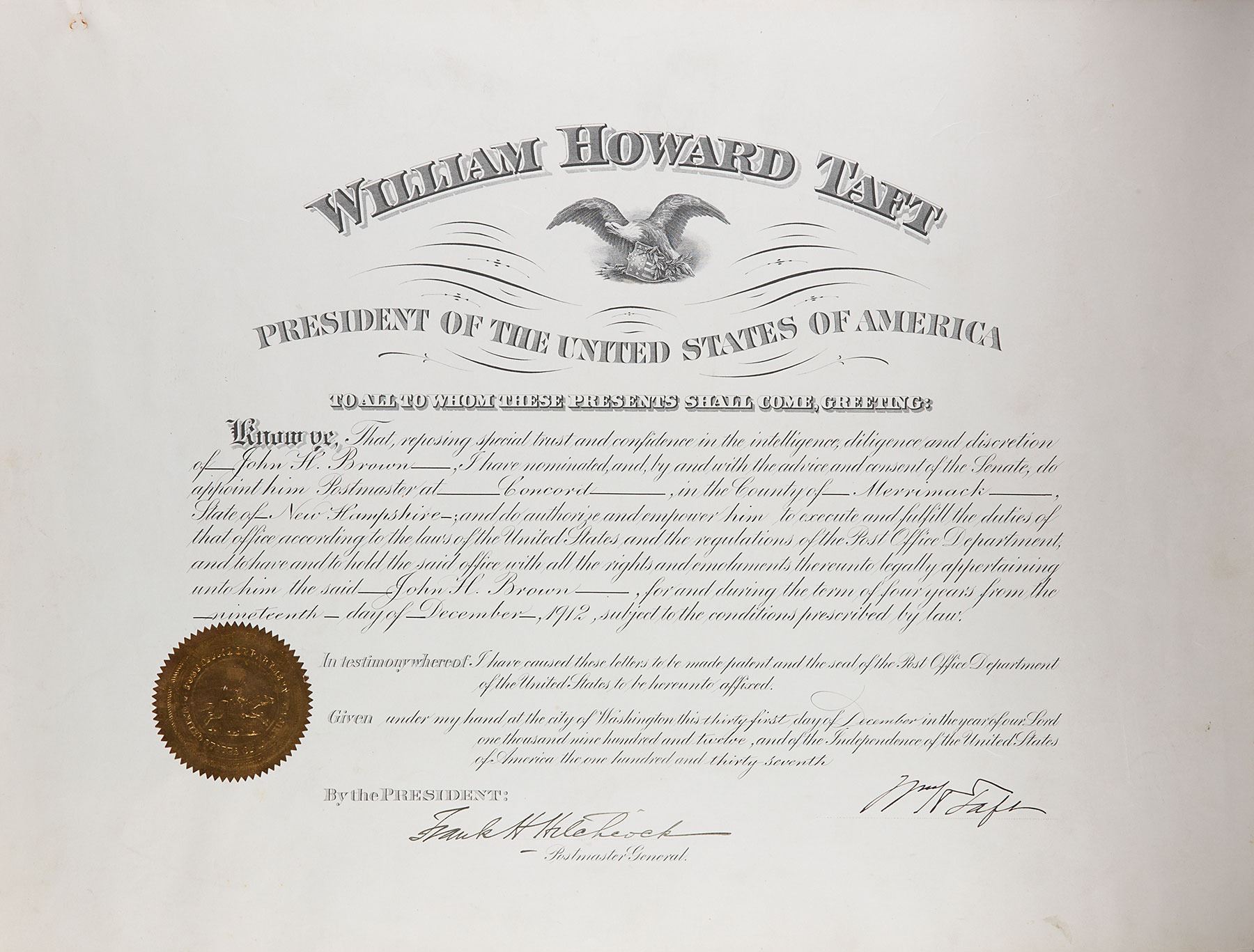 Partly-printed DS as president, signed “Wm. H. Taft,” one page, 21 x 16, December 31, 1912. President Taft appoints John H. Brown as "Postmaster at Concord, in the County of Merrimack, State of New Hampshire." Signed at the conclusion by Taft, and countersigned by Postmaster General Frank H. Hitchcock. Lower left corner retains original gold seal. In fine condition, with scattered light creasing, and a rusty clip impression to the top edge.