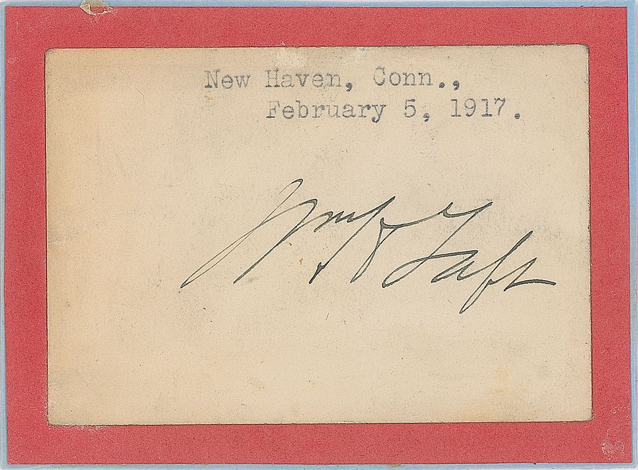 Ink signature, "Wm. H. Taft,” on an off-white 3 x 2 sheet bearing typed collector's notations, "New Haven, Conn., February 5, 1917," and affixed to a slightly larger mount. In fine condition, with light soiling.