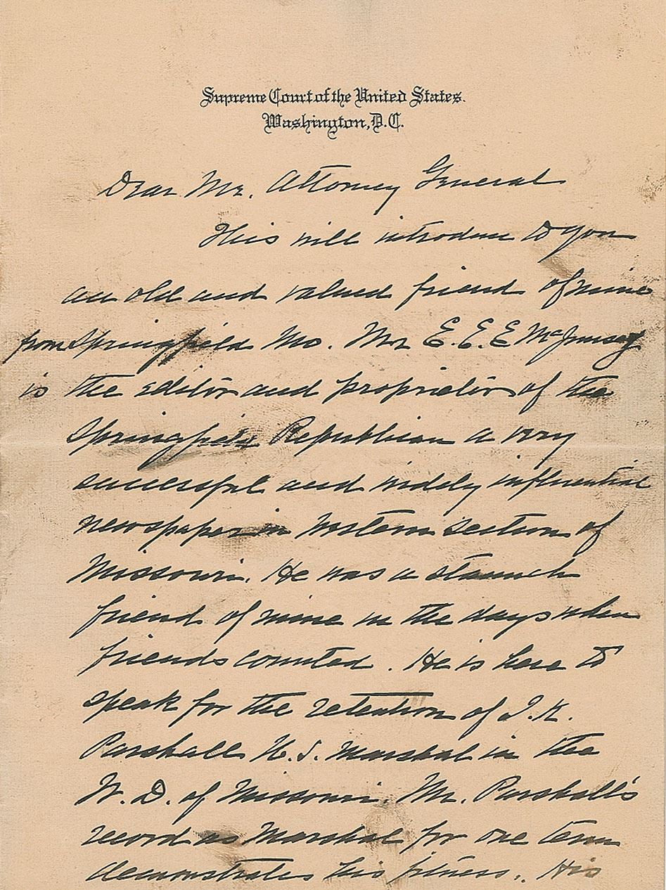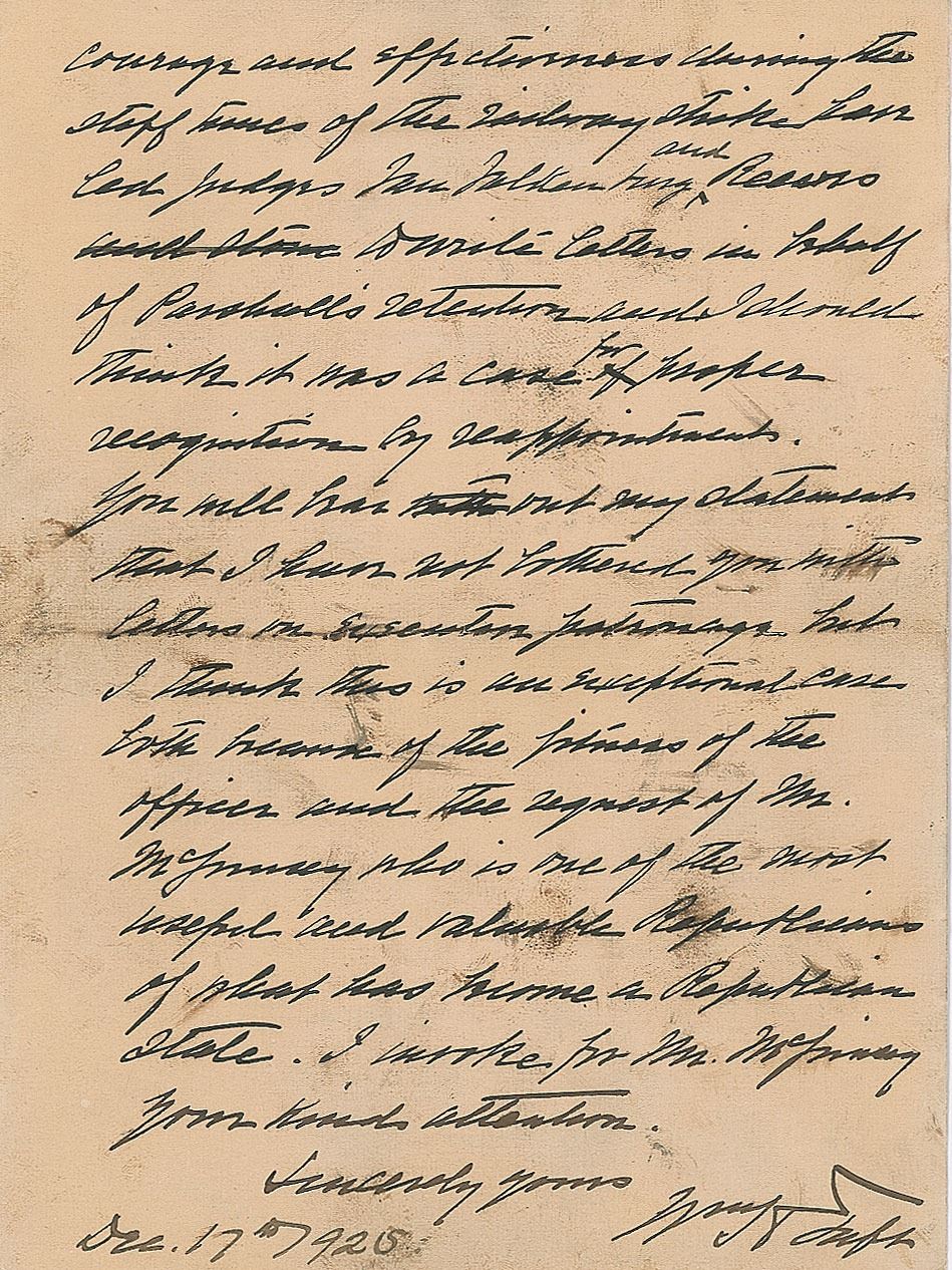 ALS signed “Wm. H. Taft,” two pages on two adjoining sheets, 5.75 x 7.75, Supreme Court of the United States letterhead, December 17, 1925. Letter to Attorney General John G. Sargent, in full: "This will introduce to you an old and valued friend of mine from Springfield, Mo. Mr. E. E. E. McJimsey is the editor and proprietor of the Springfield republican, a very successful and highly influential newspaper in Western section of Missouri. He was a staunch friend of mine in the days when friends counted. He is here to speak for the retention of I. K. Parshall, U.S. Marshal in the N. D. of Missouri. Mr. Parshall's record as Marshall for one term demonstrates his fitness. His courage and effectiveness during the stiff times of the railroad strike have led Judges Tan Falkenberg and Reaves to write letters in behalf of Parshall's retention and I should think it was a case for proper recognition by reappointment. You will bear out my statement that I have not bothered you with letters on executive patronage but I think his is an exceptional case both because of the fitness of the officer and the request of Mr. McJimsey who is one of the most useful and valuable Republicans of what has become a Republican state. I invoke for Mr. McJimsey your kind attention." In fine condition, with scattered brushing to the ink, some of which reveal palm and fingerprint marks.