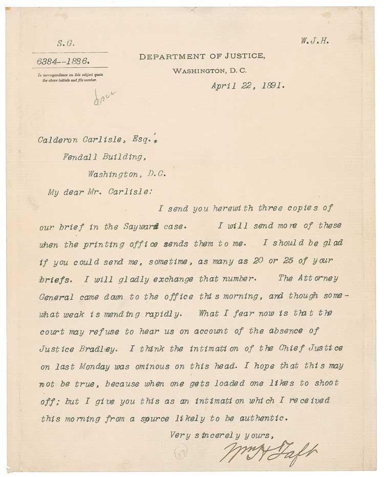Early TLS signed “Wm. H. Taft,” one page, 8 x 10, Department of Justice letterhead, April 22, 1891. Letter to Calderon Carlisle. In part: “I send you herewith three copies of our brief in the Sayward case…The Attorney General came down to the office this morning, and though somewhat weak is mending rapidly. What I fear now is that the court may refuse to hear us on account of the absence of Justice Bradley. I think the intimation of the Chief Justice on last Monday was ominous on this head. I hope that this may not be true, because when one gets loaded one likes to shoot off; but I give you this as an intimation which I received this morning from a source likely to be authentic.” Paperclip impression to top left, heavy folds to both vertical edges, and a few small corner creases, otherwise fine condition.