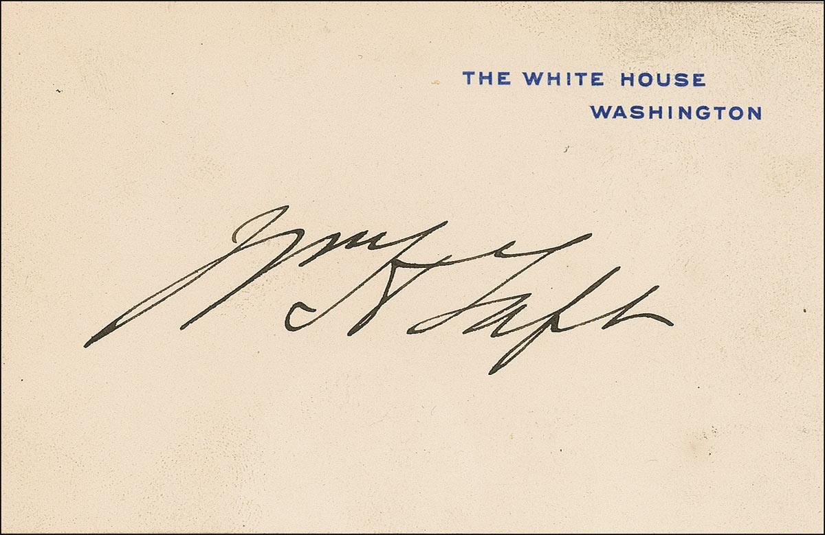 Signed White House card, signed in black ink, “Wm. H. Taft.” In fine condition, with a bit of scattered trivial soiling, and card affixed by its reverse top edge to an identical size sheet. Pre-certified John Reznikoff/PSA/DNA and RRAuction COA.
