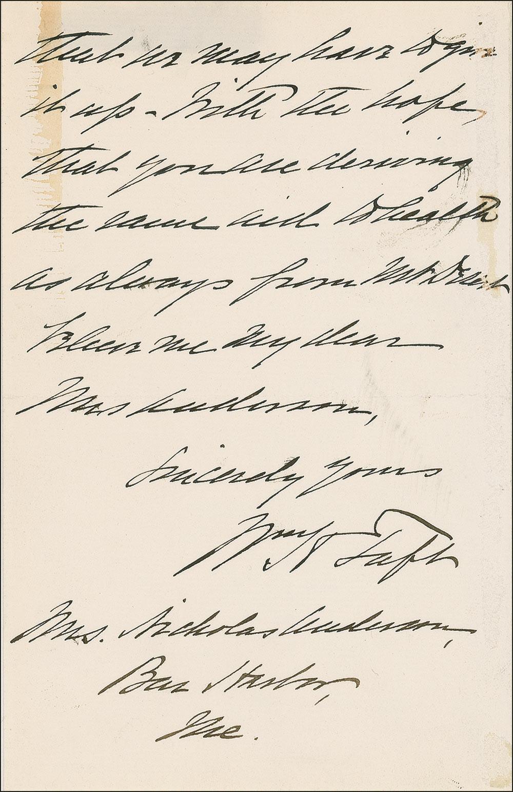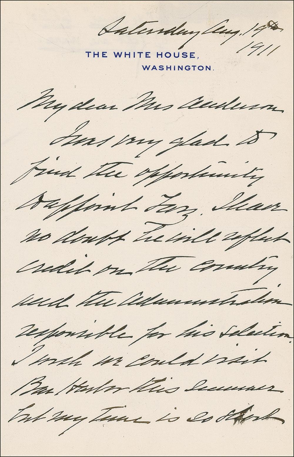 TLS signed “Wm. H. Taft,” one page, 8 x 10.5, personal letterhead, April 28, 1915. Letter to Judge William Henry Hunt urging him to run for Senate. In part: “They are talking in Montana of a compromise between the Republicans and the Progressives, by which the regular Republicans are to get the Governorship, and Joe Dixon is to be returned to the Senate. I think this is a fatal mistake. We need the Senate badly, so that the next Republican Administration can remedy some mistakes of the present Democratic Administration, and to pin our faith on Joe Dixon, when the majority, if we win it, will only be one or two, is as foolish as any proposition I know. It has occurred to Hillies to ask whether you would be a candidate for the Senate in Montana. You have had some precedents to justify such a course…and your standing is so good in Montana that it is confidently asserted that your candidacy would clear things up.” Taft also pens “personal” at the top of the page. Hunt was a state and federal judge and a territorial governor of Puerto Rico. On December 12, 1910, Hunt was nominated by President William Howard Taft to the newly created United States Commerce Court. Hunt was confirmed on January 31, 1911. The Commerce Court was abolished three years later, on December 13, 1913. In fine condition, with several intersecting folds, (a couple of which pass through signature). Pre-certified John Reznikoff/PSA/DNA and RRAuction COA.