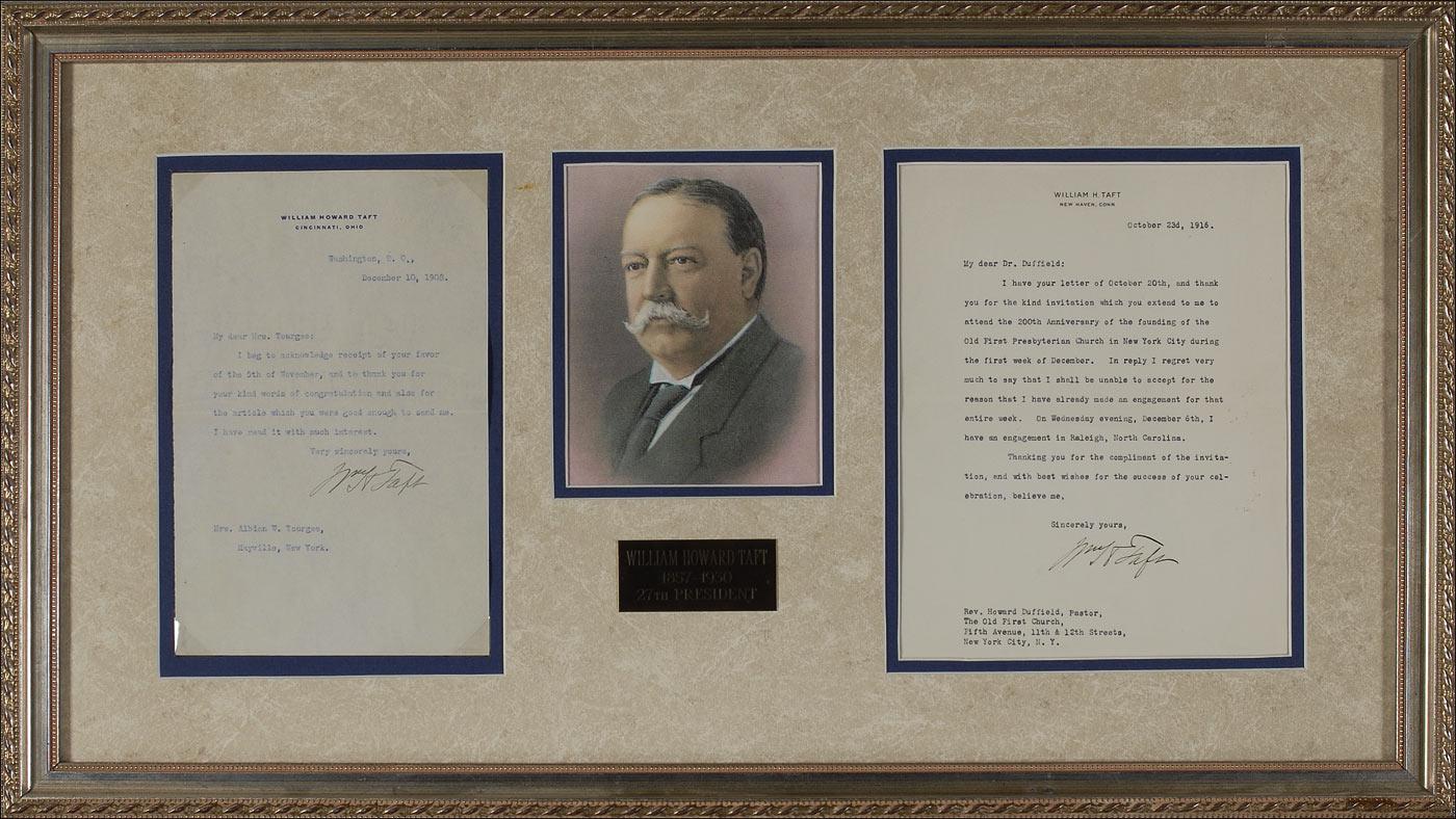 Two TLSs, both signed “Wm. H. Taft,” both one page on his personal letter head. The first letter, dated December 10, 1908, signed as president-elect sends thanks to Mrs. Albion Tourgee, and reads, in full: “I beg to acknowledge receipt of your favor of the 5th of November, and to thank you for your kind words of congratulations and also for the article which you were good enough to send me. I have read it with great interest.”; second letter, dated October 23, 1916, declines an invitation to attend the 200th Anniversary of the founding of the Old First Presbyterian Church. Both letters are double matted and framed together with a color portrait and a small plaque to an overall size of 25 x 14. In fine overall condition. Oversized. Pre-certified John Reznikoff/PSA/DNA and RRAuction COA.