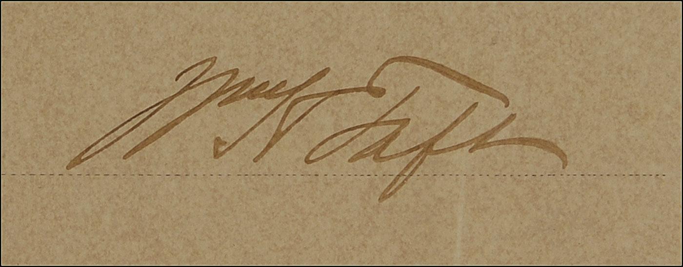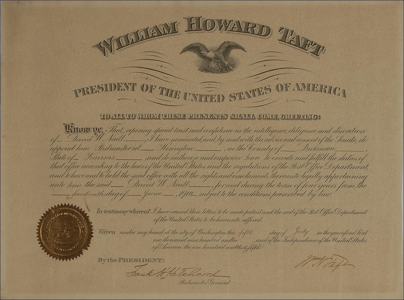 Partly-printed DS as president, signed “Wm. H. Taft,” one page, 18 x 14, July 5, 1910. President Taft appoints David W. Naill to the position of Postmaster of Herington, Kansas. Signed at the conclusion by Taft and countersigned by Postmaster General Frank H. Hitchcock. Some scattered light creases, uniform toning from previous display, and a lightly trimmed right edge, otherwise fine condition. The gold foil seal is crisp and intact. Pre-certified John Reznikoff/PSA/DNA and RRAuction COA.