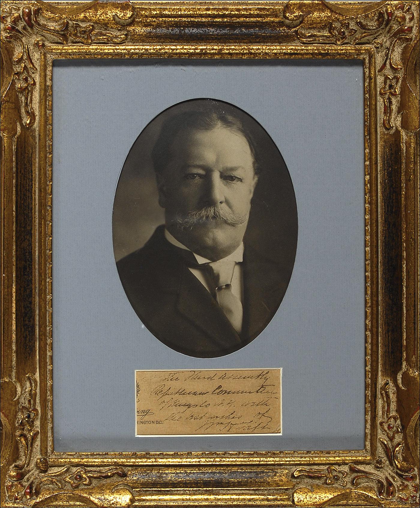 Ink signature and inscription, “For the Third Assembly Republican Committee of Kings Co. N.Y. with the best wishes of Wm. H. Taft,” on an off-white slip of clipped letterhead. Matted and framed with a portrait of Taft, to an overall size of 10.5 x 12.5. In very good condition, with uniform moderate toning, and some scattered light skipping to the light, but legible signature and inscription. Pre-certified John Reznikoff/PSA/DNA and RRAuction COA.