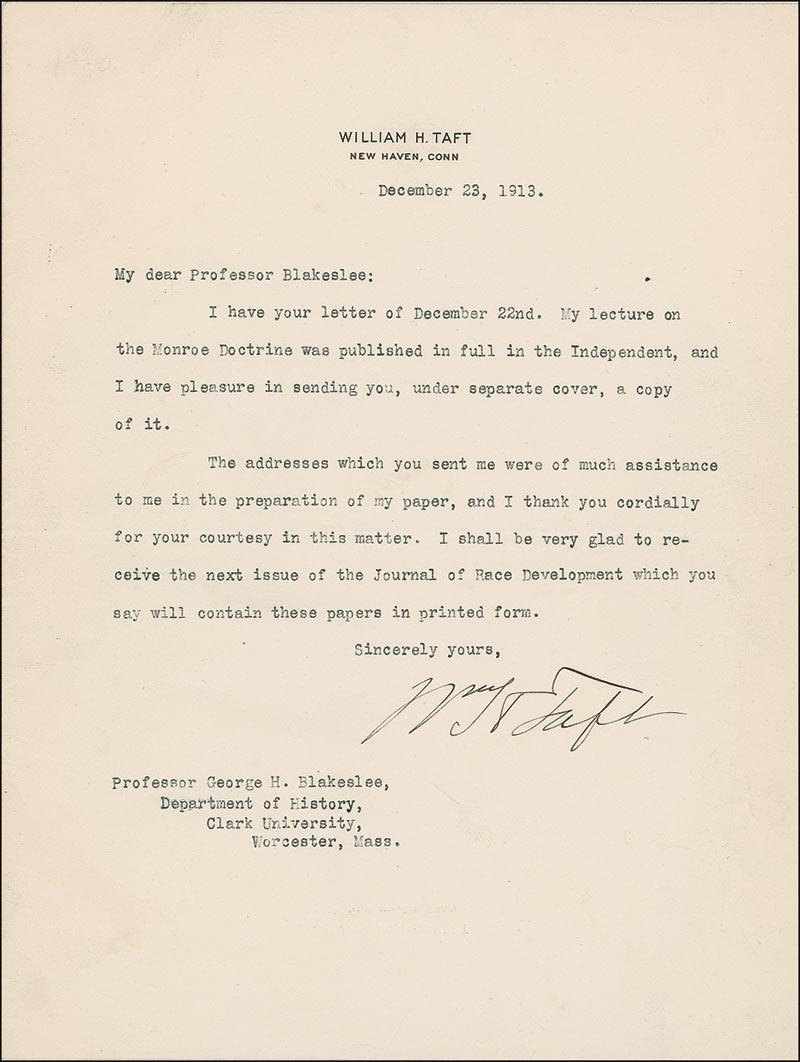 TLS signed “Wm. H. Taft,” one page, 7 x 9.25, personal letterhead, December 23, 1913. Taft writes to Prof. George Blakeslee of Clark University. In part: “My lecture on the Monroe Doctrine was published in full in the Independent, and I have pleasure in sending you, under separate cover, a copy of it. The addresses which you sent me were of much assistance to me in the preparation of my paper, and I thank you cordially for your courtesy in this matter. I shall be very glad to receive the next issue of the Journal of Race Development which you say will contain these papers in printed form.” In fine condition, with a few light creases and wrinkles.