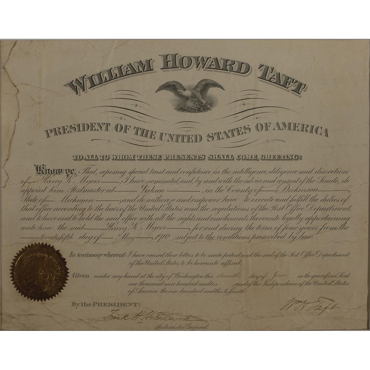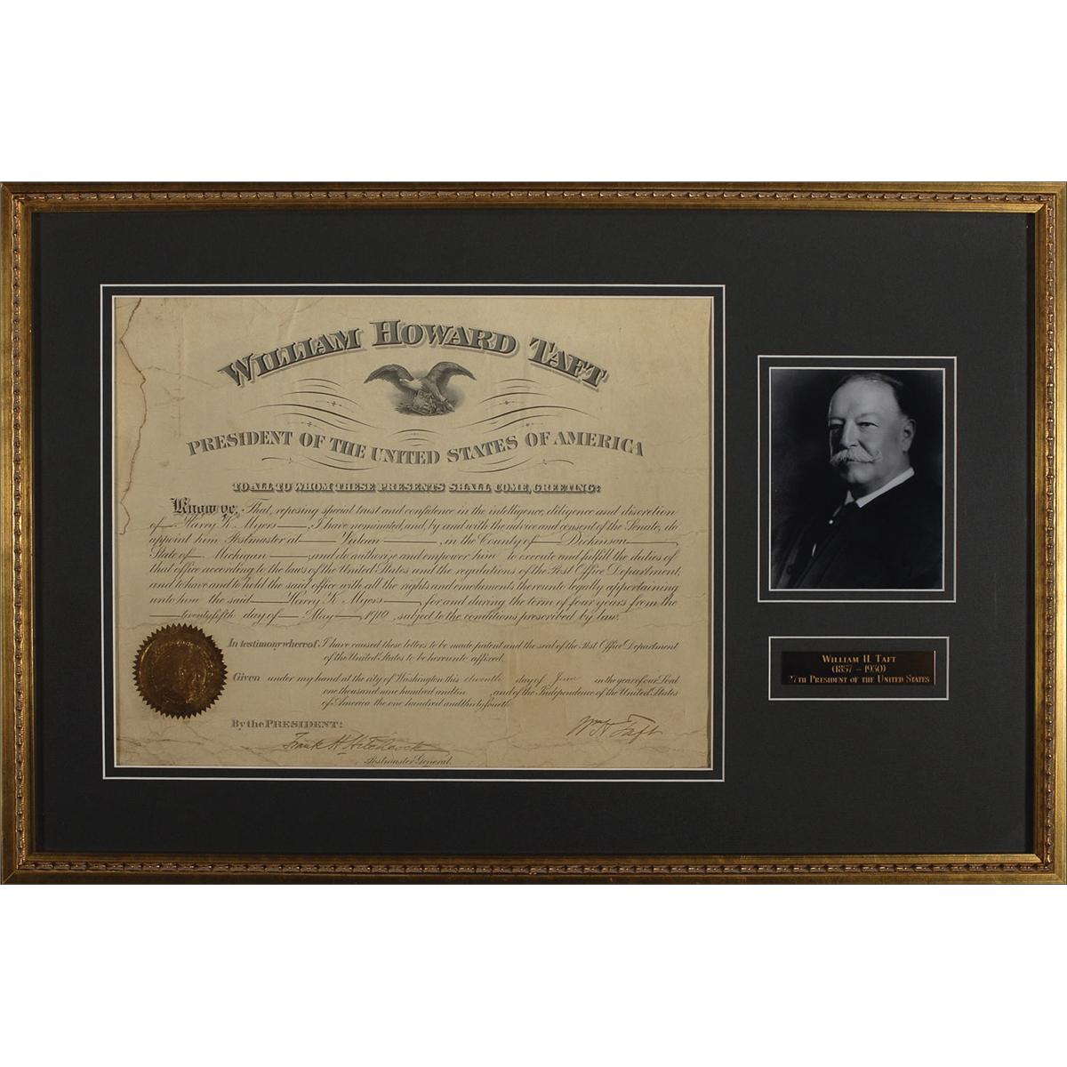 Partly-printed DS as president, signed “Wm. H. Taft,” one page, 16.5 x 13, June 11, 1910. Taft appoints Harry K. Myers Postmaster of Vulcan, Michigan. Signed at the conclusion by Taft and countersigned by Postmaster General Frank Hitchcock. Archivally double matted and framed with a portrait of Taft and a name plaque to an overall size of 29.25 x 19.5. In good condition, with moderate creasing, with a few small creases lightly affecting signature, scattered soiling, and a uniform shade of toning, with several smaller areas of heavier toning. The gold foil seal is worn but intact. Oversized.