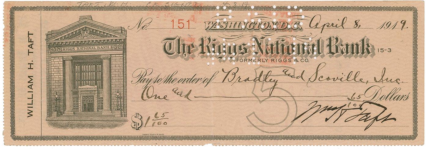 Personal check, 8.5 x 3, filled out in another hand and signed by Taft, “Wm. H. Taft,” payable to Bradley and Scoville, Inc. for $1.65, April 8, 1919. In very good condition, with vertical fold, expected bank cancellation stamps and holes, a few small chips, and light handling wear.
