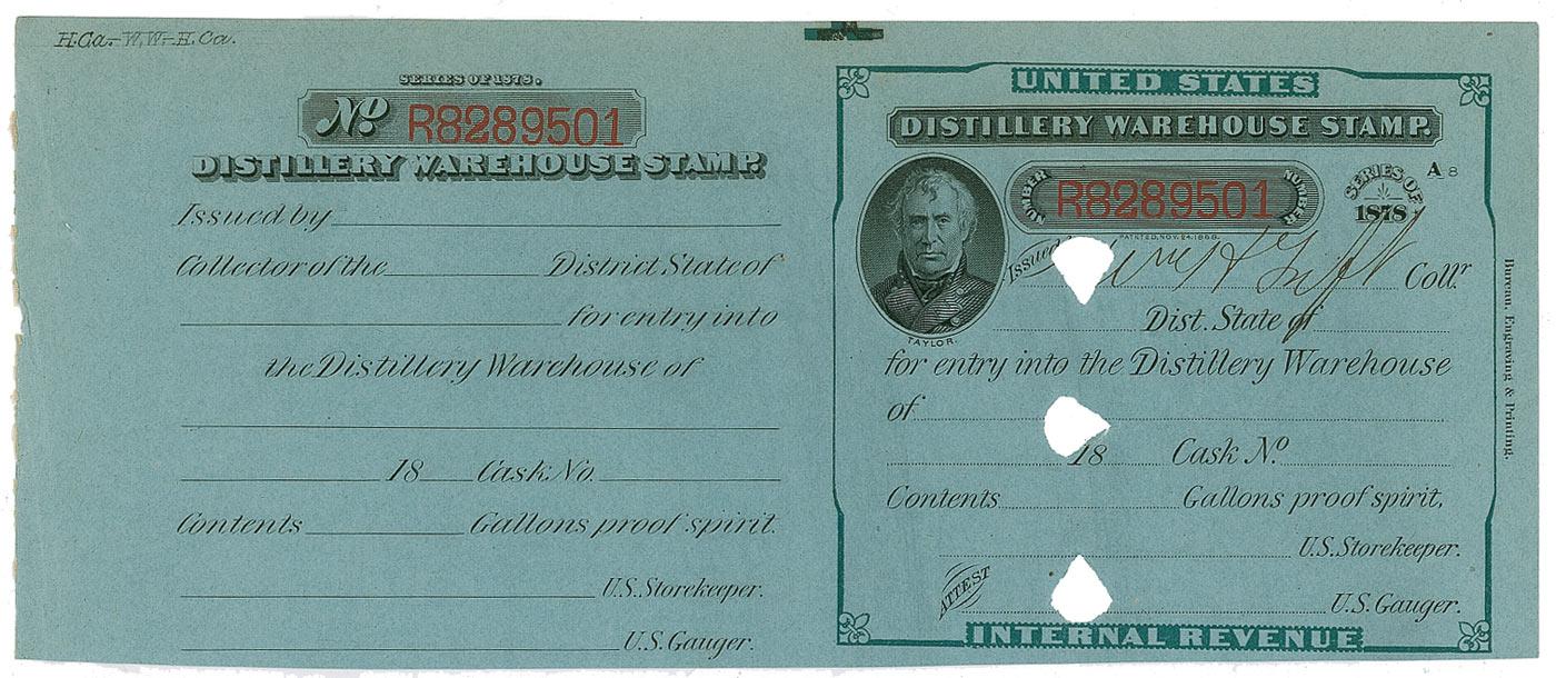 DS, signed “Wm. H. Taft,” one page, 7.75 x 3.25, no date [“Series of 1878”]. An unissued Distillery Warehouse Stamp, bearing a portrait vignette of Zachary Taylor, signed by Taft as Collector in Cincinnati. In fine condition, with punch cancellation holes, one affecting middle portion of signature of document.