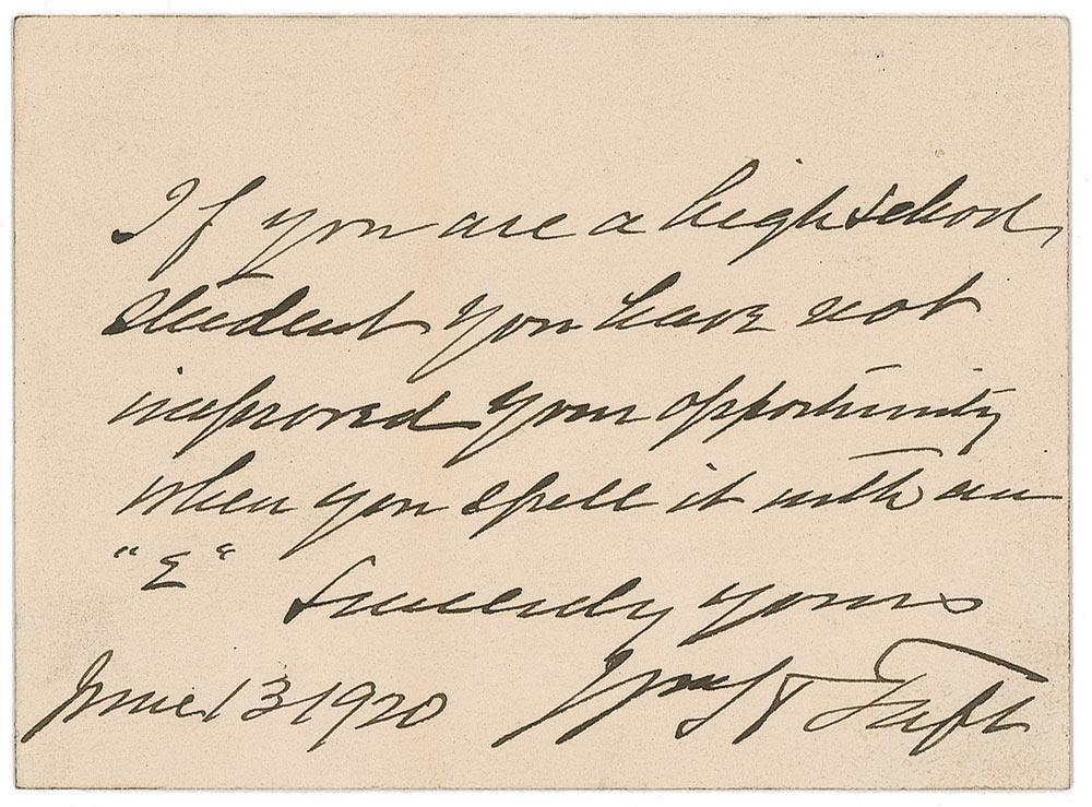 Brief ALS signed “Wm. H. Taft,” one page, 3.5 x 2.5, June 13, 1920. Taft chastises a young student. In full: “If you are a high school student you have not improved your opportunity when you spell it with an ‘E.’” In fine condition, with a bit of trivial toning to the left side of the card.