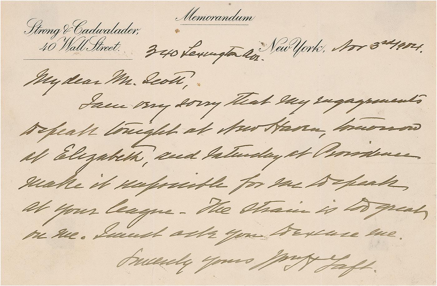 ALS signed “Wm. H. Taft,” one page, 8 x 5, Strong and Cadwalader (the predecessor of Cadwalader Wickersham & Taft, the major NY law firm that bears his name) letterhead, November 3, 1904. Letter declining a speaking engagement. In full: “I am very sorry that my engagements to speak tonight at New Haven, tomorrow in Elizabeth, and Saturday in Providence make it impossible for me to speak at your league. The strain is too great on me. I must ask you to excuse me.” In fine condition, with two vertical folds, one through a single letter of signature, a uniform shade of mild toning, and a few stray ink spots.
