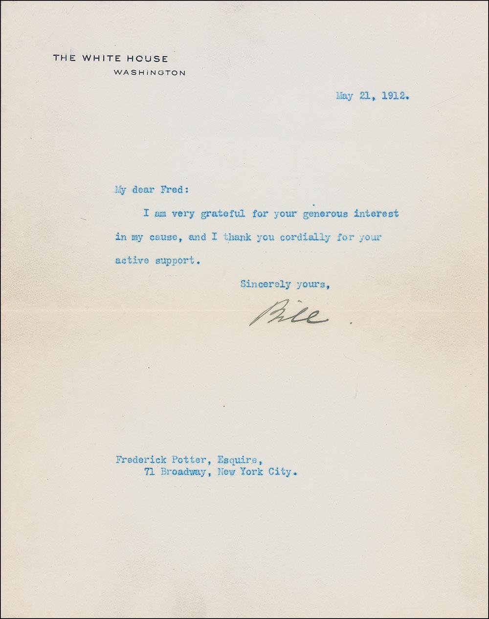 TLS as president signed “Bill,” one page, 7 x 9, White House letterhead, May 21, 1912. Short letter to Frederick Potter in New York. In full: “I am very grateful for your generous interest in my cause, and I thank you cordially for your active support.” Central horizontal fold through signature, and some scattered light toning, otherwise fine condition. Accompanied by the original mailing envelope. A most uncommon form of Taft’s signature.