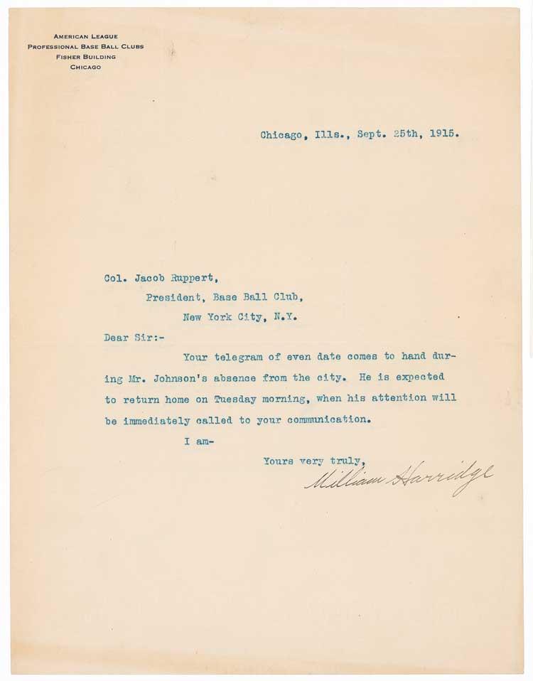 Third president of the American League (1883–1971) who held the office for an unprecedented three decades, from 1931 to 1959. TLS, one page, 8.5 x 11, American League letterhead, September 25, 1915. Letter to Col. Rupert of the New York Yankees. In full: “Your telegram of even date comes to hand during Mr. Johnson’s absence from the city. He is expected to return home on Tuesday morning, when his attention will be immediately called to your communication.” Accompanied by a certificate of authenticity from James Spence. A mild overall shade of toning, intersecting mailing folds, one through a single letter of signature, and some creasing to left side, otherwise fine condition. Pre-certified Steve Grad/PSA/DNA and RRAuction COA.