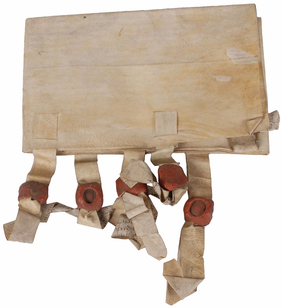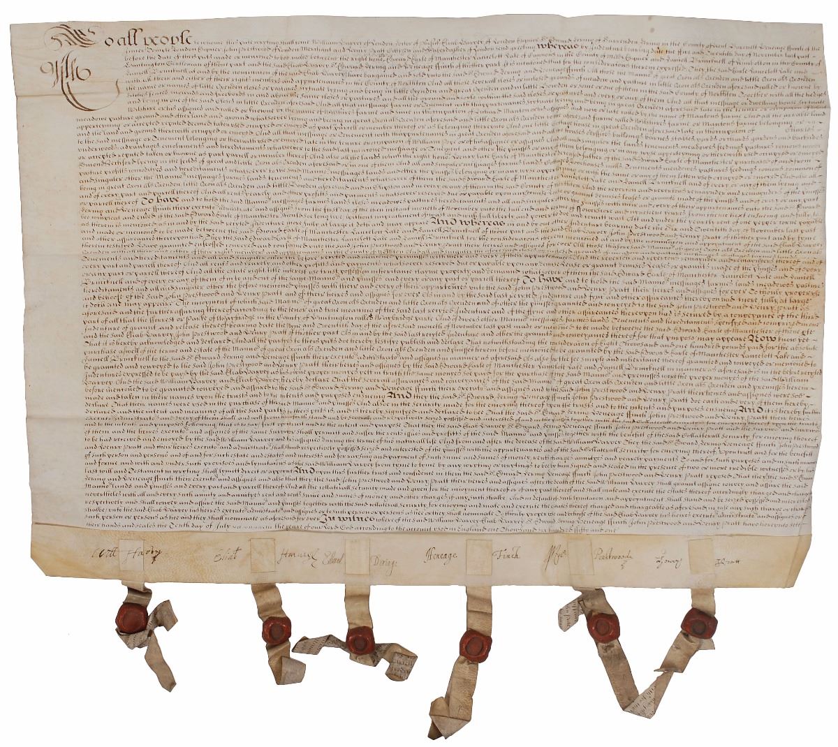 English physician (1578–1657) who was the first to describe in detail the circulation of blood. Extraordinarily rare vellum manuscript DS, signed “Will Harvey,” one page, 29.5 x 21, July 10, 1651. Indenture between “Doctor of Phisick” William Harvey, his brother Eliab Harvey, Edward Dering, Heneage Finch (1st Earl of Nottingham), John Prestwoode, and Henry Pratt, for the assignment of “all that park of Baron comonly [sic] called Baron Parke…in the said county of Liecester.” Signed at the bottom by the interested parties, with William Harvey and his wife Elizabeth signing in the lower left; red wax pendant seal tags are attached below for each of the signers. In fine condition.
