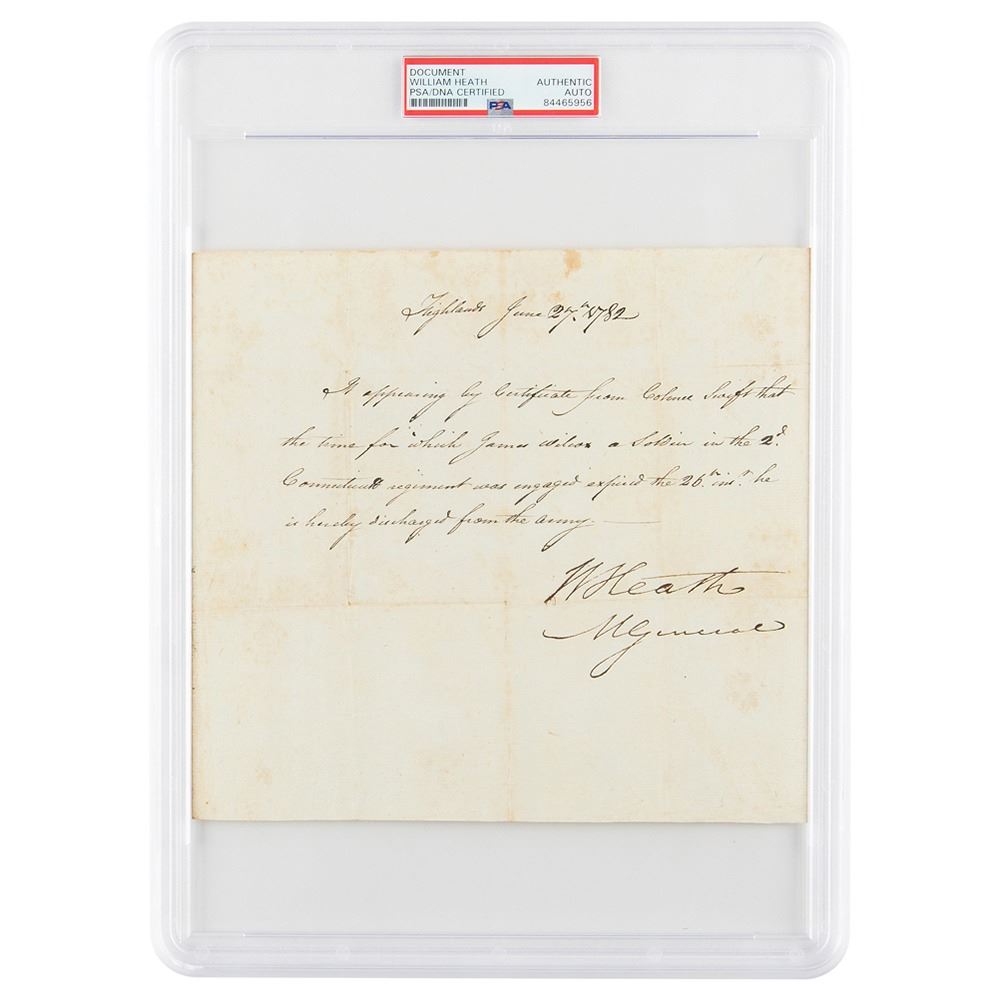 Revolutionary War-dated ADS signed “W. Heath, M. General,†one page, 8.5 x 8, June 27, 1782. Handwritten discharge document for a veteran of the Revolution, in full: "It appearing by certificate from Colonel Swift that the time for which James Wilcox a Soldier in the 2d Connecticutt regiment was engaged expired the 26th inst. he is hereby discharged from the Army." In very good to fine condition, with scattered light staining. Encapsulated in a PSA/DNA authentication holder.