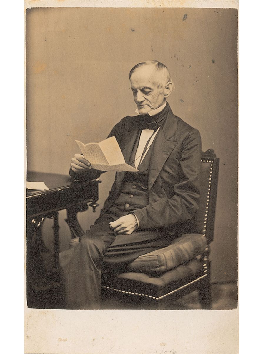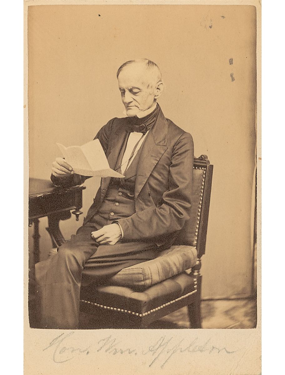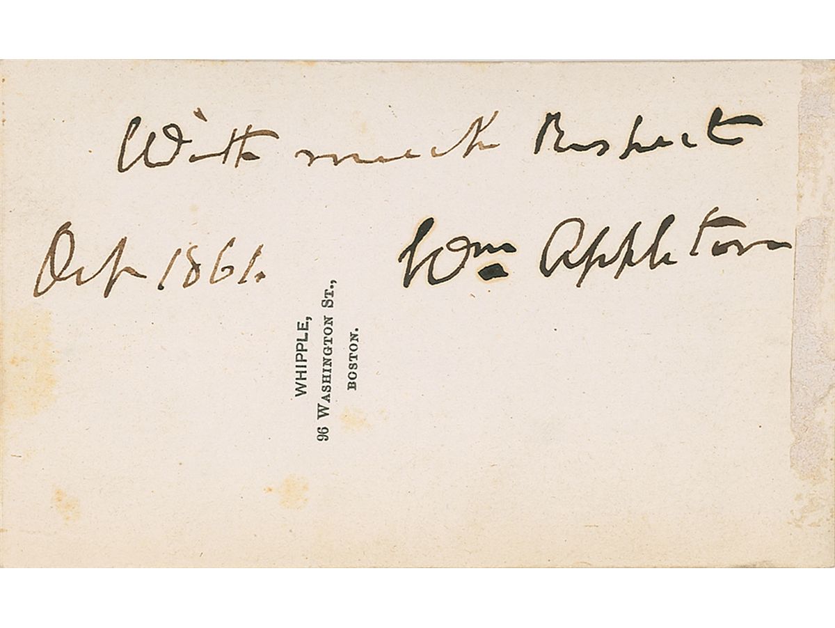 American publisher (1814–1899) who ran D. Appleton & Company, which published works by Lewis Carroll, Arthur Conan Doyle, Charles Darwin, and John Stuart Mill, among others. Original 2.5 x 4 carte-de-visite portrait of Appleton reading a book by Whipple of Boston, signed on the reverse in black ink, “With much respect, Wm. Appleton, Oct. 1861.” Tape remnants and light soiling to reverse, otherwise fine condition. Accompanied by an unsigned identical carte-de-visite.