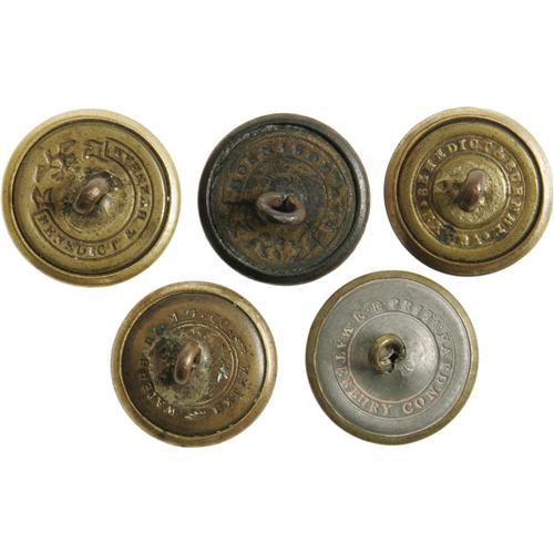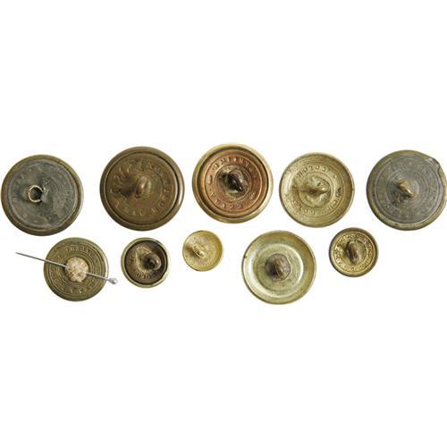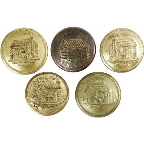 <B>William Henry Harrison 1840 Presidential Campaign Buttons.</B></I> A group of 15 buttons as follows: Two Albert PC 138-A buttons, plain log cabin with slogan: "<I>Harrison & Reform</B></I>", 21mm, maker-marked "<I>R. & W. Robinson and eagle</B></I>" on reverse. Albert 145, log cabin with barrel in front, 21mm, maker-marked "<I>R. & W. Robinson and eagle</B></I>" . Albert PC 147-A, log cabin with six panel roof with a tobacco plant on left side, 21mm, maker-marked "<I>E.E. Pritchard/Waterbury Con.</B></I>". Albert PC 150-A, log cabin with plow in right foreground and large tree at rear of cabin, 21mm, maker-marked "<I>Waterbury. M'g. Co./Extra</B></I>". Albert PC 152-A, log cabin with outside chimney on the right side, 21mm, maker-marked "<I>Benedict & Burnham</B></I>" and eagle. Albert PC 153-A, log cabin with door in right side, flagpole at left, 20mm, marked "<I>Extra/Rich</B></I>". Albert PC 154-A, log cabin with door on left side, flag pole at right, 20mm, maker-marked "<I>Extra Rich</B></I>". Albert PC 155-A, log cabin with outside chimney on left side, barrel in left foreground, 22mm, maker-marked "<I>Benedict & Burnham</B></I>" and eagle. Albert PC 159-A, log cabin with a roof of six panels, barrel at left side, 16mm, maker-marked "<I>Holmes & Floyd.s/Patent</B></I>". Albert PC 160-A, log cabin with chimney at right, recessed octagonal border, roof with nine planks, 19mm, reverse blank. Albert PC 160-B, log cabin with chimney at right, on recessed octagonal lined field, roof with 7 planks, 19mm, marked "<I>Rich Gold Color</B></I>". Albert PC 163-AV, log cabin with smoking chimney at right, four panel roof, 13mm, back mark of 14 four-pointed ornaments. Albert PC 184-A, barrel on a plain field, 13mm, marked "<I>Best Gold Color</B></I>". Albert PC 186-B, barrel impressed on a plain field, 10mm, back mark of arcs. All buttons in near fine condition.<BR><BR><b>Shipping:</b> Small Collectibles (<a target="_blank" href="http://www.heritageauctions.com/common/shipping.php">view shipping information</a>)