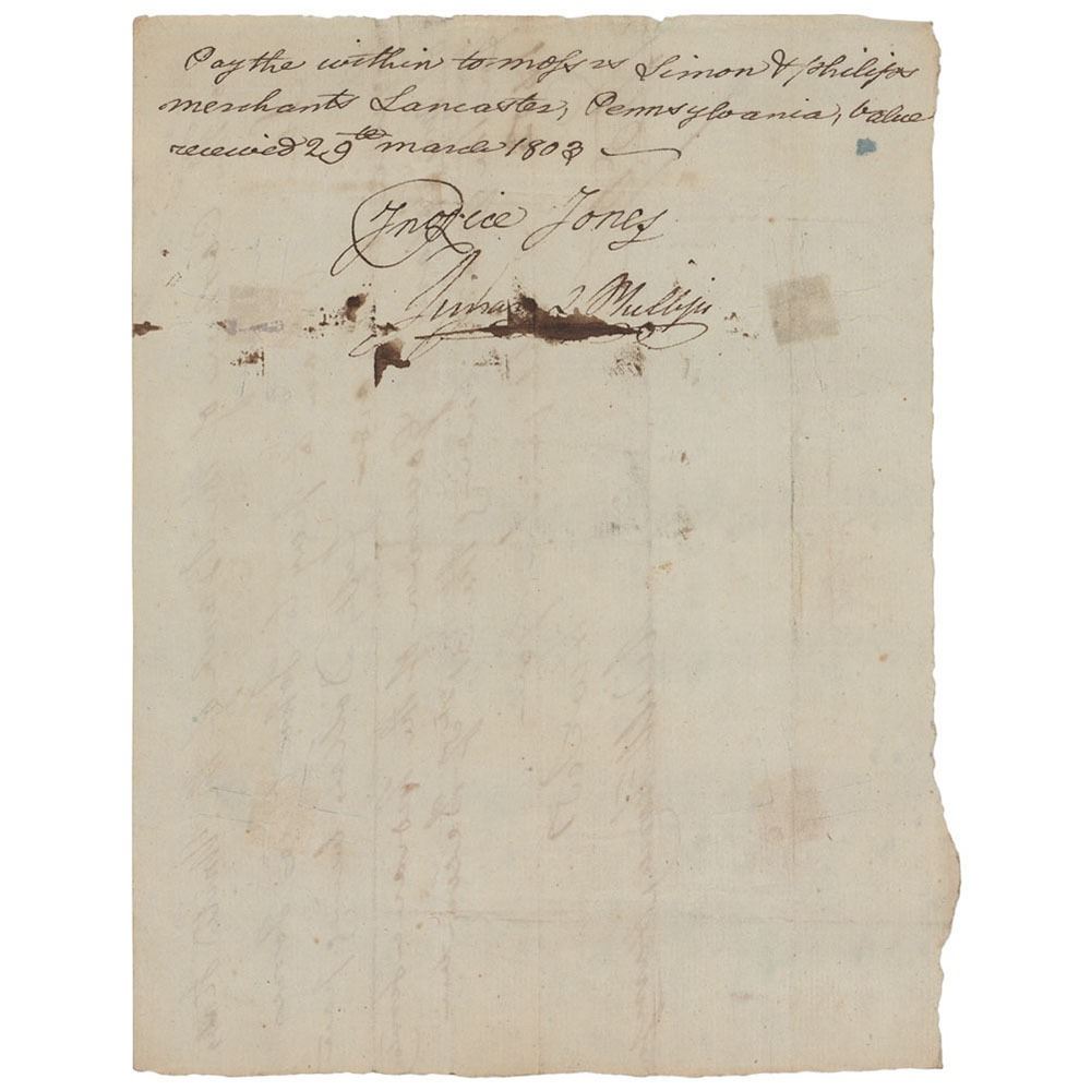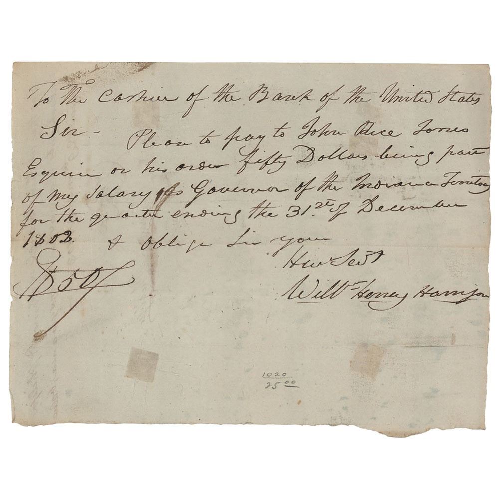 Very early ADS, signed “Will'm Henry Harrison,†one page, 8 x 6, December 31, 1802. Handwritten pay order submitted to the "Cashier of the Bank of the United States," in full: "Please to pay to John Rice Jones Esquire or his order fifty Dollars being part of my salary for Governor of the Indiana Territory for the quarter ending the 31st of December 1802." Endorsed on the reverse by Jones, directing the payment to Simon & Philips, merchants in Lancaster, Pennsylvania. In fine condition, with four small old tape stains.