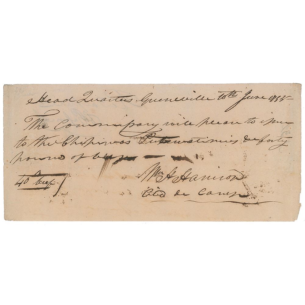 Scarce ADS, signed "Wm. H. Harrison, aid de camp," one page, 9 x 4.25, June 10, 1794. Order reads, in full: "The commissary will please to issue to the Chickisaws [sic] Patawatimies forty pounds of beef." Signed at the conclusion by William Henry Harrison as Anthony Wayne's aide de camp. In fine condition. Accompanied by an engraved portrait bearing a facsimile signature.
