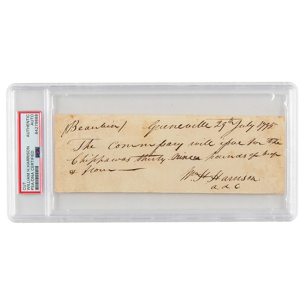 ADS signed "Wm. H. Harrison, a.d.c.," one page, 7.5 x 2.5, July 29, 1795. Handwritten document by Harrison from his headquarters at Greenville, Ohio, directing supplies to the Chippewa Indians just prior to the Treaty of Greenville. In full: "The company will issue for the Chippawas thirty nine pounds of beef & flour." In fine condition, with scattered faint staining. Encapsulated in a PSA/DNA authentication holder.