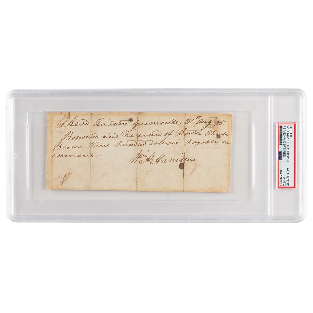 ADS, signed & ldquo;Wm. H. Harrison,& rdquo; one page, 7.5 x 3.25, August 31, 1795. Handwritten document by Harrison from his headquarters at Greenville, Ohio, in full: "Borrowed and received of Doctor Charles Brown three hundred dollars payable on demand." Affixed to a same-size sheet and in very good to fine condition, with light soiling and staining, vertical folds, and toning from prior display. Encapsulated in a PSA/DNA authentication holder.
