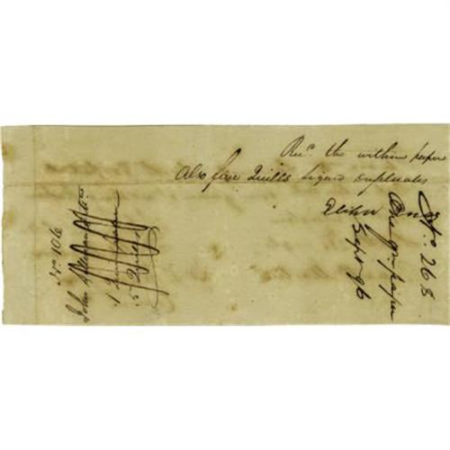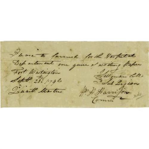 <B>William Henry Harrison Manuscript Document Signed</B></I> "<I>Wm H Harrison</B></I>" as Commander, one page, 7.5" x 3.5", Fort Washington, September 20, 1796, requesting the quartermaster "<I>to furnish for the Hospital Department one quire of writing paper.</B></I>" Harrison joined the army in 1791, and was sent to the Northwest Territory where he served under "Mad" Anthony Wayne. Under Wayne's command, he fought at the Battle of Fallen Timbers in 1794; and the following year, signed the Treaty of Greenville which effectively opened the way for settlement of what is today Ohio. A fine and early example of Harrison's signature.<BR><BR><b>Shipping:</b> Flat Material, Small (<a target="_blank" href="http://www.heritageauctions.com/common/shipping.php">view shipping information</a>)