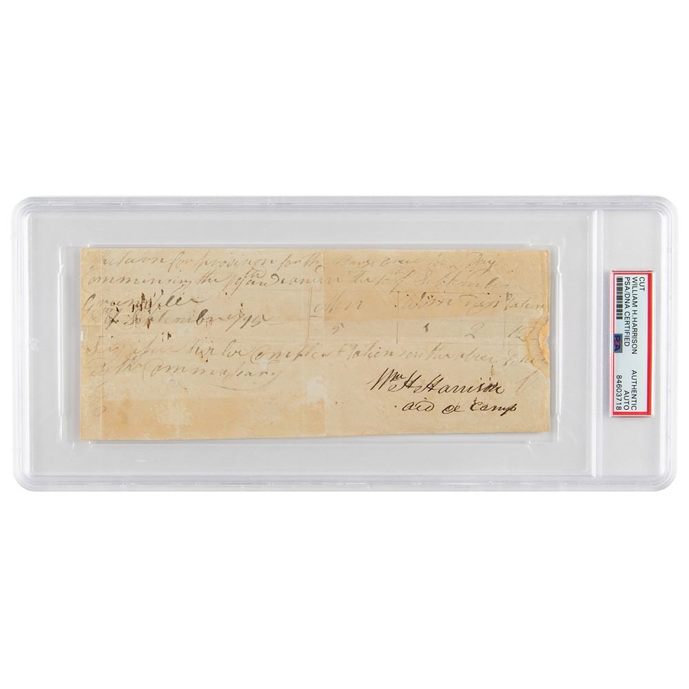 Early manuscript DS, signed “Wm. H. Harrison, Aid de Camp,†one page, 8.75 x 3.5, September 1795. Partial document regarding the use of provisions, signed boldly at the conclusion by a young William Henry Harrison. In very good to fine condition, with irregular toning, light creasing, and intersecting folds. Encapsulated in a PSA/DNA authentication holder.