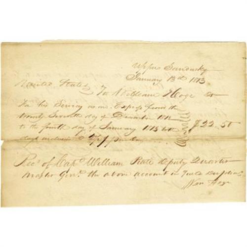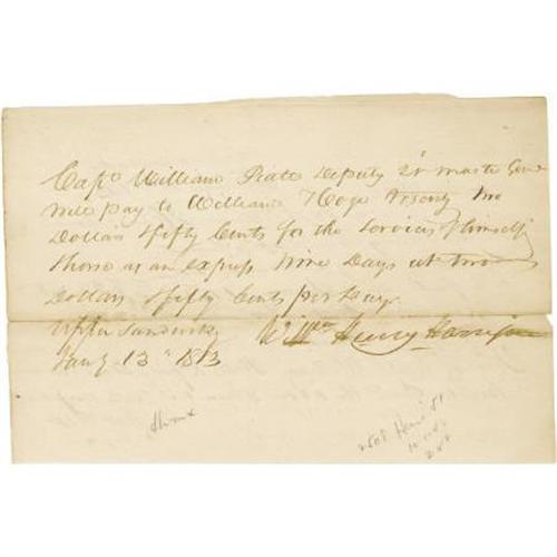 <B>William Henry Harrison Document Signed as Commander of the Army of the Northwest</B></I> “<I>Willm. Henry Harrison</B></I>”. Two pages, January 13, Upper Sandusky, 1813, Harrison's authorization on recto, receipt on verso. William Henry Harrison (1773-1841), the future 9th President of the United States, authorizes Captain William Piatt, Deputy Quarter Master General, to pay $22.50 to a William Hodge for his services as an express. Harrison was made commander of the Army of the Northwest during the War of 1812 and won victories in Indiana and Ohio before invading Canada. It was during those campaigns in Ohio that Harrison signed the document on offer. Paper toned with age, fold crease down the center of the document, a few small chips at the margins, else very good. <I>From the collection of Henry E. Luhrs.</B></I><BR><BR><b>Shipping:</b> Flat Material, Small (<a target="_blank" href="http://www.heritageauctions.com/common/shipping.php">view shipping information</a>)