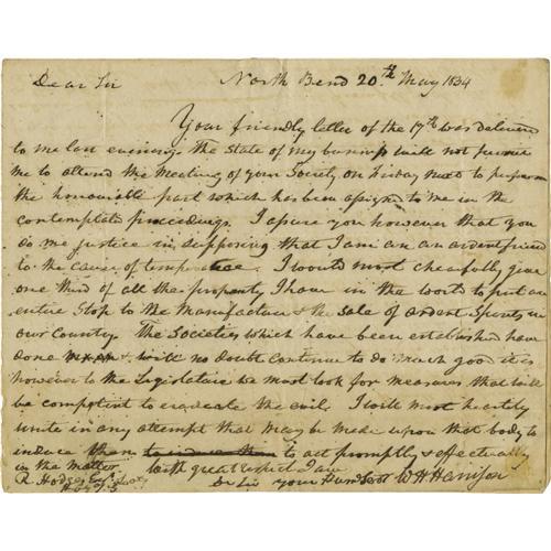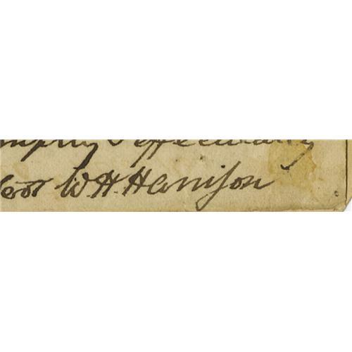 <B>William Henry Harrison Excellent Autograph Letter Signed</B></I>: The "Log Cabin and Hard Cider" candidate elected President in 1840 writes in 1834, "<I>I would most cheerfully give one third of all the property I have in the world to put an entire Stop to the Manufacture & the sale of ardent Spirits in our Country.</B></I>"<BR><BR>Signed: "<I>W. H. Harrison</B></I>", one page, 7.75" x 6.25". North Bend, May 20, 1834. To Rufus Hodges. In full: "<I>Dear Sir, Your friendly letter of the 17th was delivered to me last evening. The state of my business will not permit me to attend the Meeting of your Society on Friday next to perform the honourable part which has been assigned to me in the contemplated proceedings. I assure you however that you do me justice in supposing that I am an ardent friend to the cause of temperance. I would most cheerfully give one third of all the property I have in the world to put an entire Stop to the Manufacture & the sale of ardent Spirits in our Country. The Societies which have been established have done & will no doubt continue to do much good it is however to the Legislature we must look for measures that will be competent to eradicate the evil. I will most heartily unite in any attempt that may be made upon that body to induce them to act promptly and effectively in the matter. With great respect I am, Dr Sir, your Huml Servt</B></I>"<BR><BR>During the Indian wars of 1794, 23-year-old Lieutenant William H. Harrison, aide-de-camp to General Anthony Wayne, observed, firsthand, numerous murders and other crimes committed by drunken Indians. As Territorial Governor of Indiana and Superintendent of Indian Affairs (1800-1813), Harrison persuaded his legislature to ban the sale or trade of liquor to Indians.<BR><BR><B>Rufus Hodges</B></I> was the Recording Secretary of the Hamilton County Temperance Society which had been organized in 1833 as an auxiliary to the Ohio State Temperance Society formed in 1821. By 1835, over one million Americans belonged to temperance societies. After President Harrison's death, with the permission of the Harrison family, a committee of 11 men, including Rufus Hodges, arrived in Washington, D.C., and accompanied Harrison's body to its final resting place in North Bend, Ohio.<BR><BR>Harrison's belief that "<I>it is to the Legislature we must look for measures that will be competent to eradicate the evil</B></I>" was temporarily successful. From the late 1830s to the 1850s, Ohio and other state legislatures across the country passed prohibition laws but they were vetoed by the governors, found unconstitutional by the state supreme courts or repealed by future state legislatures.<BR><BR>On December 14, 1835, a year and a half after Harrison wrote this letter, at a state convention in Harrisburg, Pennsylvania, the Whigs nominated Harrison for President, and, in the next few months, other Whig state conventions followed suit. But New England Whigs nominated Massachusetts Senator Daniel Webster and, in the south, Tennessee Senator Hugh L. White and North Carolina Senator Willie P. Mangum received nominations. In the election of 1836, President Jackson's Vice President, Democrat Martin Van Buren, easily defeated his three Whig opponents, winning 170 electoral votes and 15 states, to Harrison's 73 votes from seven states, White's 26 votes from Tennessee and Georgia, Webster's 14 votes from Massachusetts and Mangum's 11 votes from South Carolina.<BR><BR>Four years later, the Whigs met again in Harrisburg, and this time it was at its first national convention. William Henry Harrison was nominated for President. The Democrats renominated President Martin Van Buren. As the campaign began, Van Buren supporters mocked Harrison, calling the 67-year-old War of 1812 General "Old Granny," accusing him of senility and not having the energy to inspire the people. A pro-Van Buren newspaper in Baltimore editorialized about the Whig nominee: "Give him a barrel of hard cider, and settle a pension of $2,000 a year, and our word for it he will sit the remainder of his days contented in a log cabin by the side of a 'sea coal' fire." Whigs took advantage of this and, even though Harrison was a teetotaler and would never drink hard cider, an alcoholic drink, and his home looked nothing like a log cabin, they declared that Harrison was "the log cabin and hard cider candidate," a man of the common people. They depicted Van Buren as a wealthy snob who was out of touch with the people. The truth was, it was Harrison who came from a wealthy, prominent Virginia family (his father had been Governor of Virginia and signed the Declaration of Independence) while Van Buren was from a poor, upstate New York working family (his father was a farmer and innkeeper). Log cabins and, much to Harrison's displeasure, cider barrels adorned belt buckles, clothing buttons, drinking glasses, metal tokens, bandanas, ribbons, and spoons. Even in Van Buren's own state, the New York <I>Daily Whig</B></I> published a letter bemoaning that "Log-Cabin Candidate is the term of reproach given...to General Harrison... by pampered office holders... who sneer at the idea of making a poor man President of the United States." The Whigs' "Log Cabin and Hard Cider Campaign" was a resounding success. Harrison swept the northeast (except for N.H.) and most of the rest of the nation and was easily elected with 234 electoral votes from 19 states to Van Buren's 60 votes from seven states.<BR><BR>Harrison's has addressed his letter to "<I>Rufus Hodges, Esq./Cincinnati</B></I>" on the integral leaf attached at the top edge rather than the customary left edge, "Paid" is handwritten in the upper right, and the docket "Gen. W. H. Harrison/May 20, 1834" is penned vertically at the lower left, probably by Hodges.<BR><BR>Harrison's powerful condemnation, in this letter, of the manufacture and sale of alcohol as an evil which must be eradicated is in sharp contrast to the false image of an old man drinking hard