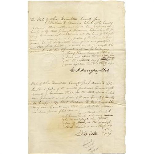 <B>William Henry Harrison Partially Printed Document Signed,</B></I> “<I>W. H. Harrison Clerk,</B></I>” three pages, 8” x 13”, County, Ohio, June 16, 1836. The nation's future 9th President here signs a routine land deed in his capacity of Clerk of Court. Bold signature, fine condition. Harrison's modest office at this point in his career was at odds with his elevated stature in American politics. A celebrated war hero, he had already been a U.S. Senator from Ohio and, at the time of this signing, was the Northern Whig candidate for U.S. President. <I>From the collection of Henry E. Luhrs.</B></I><BR><BR><b>Shipping:</b> Flat Material, Small (<a target="_blank" href="http://www.heritageauctions.com/common/shipping.php">view shipping information</a>)