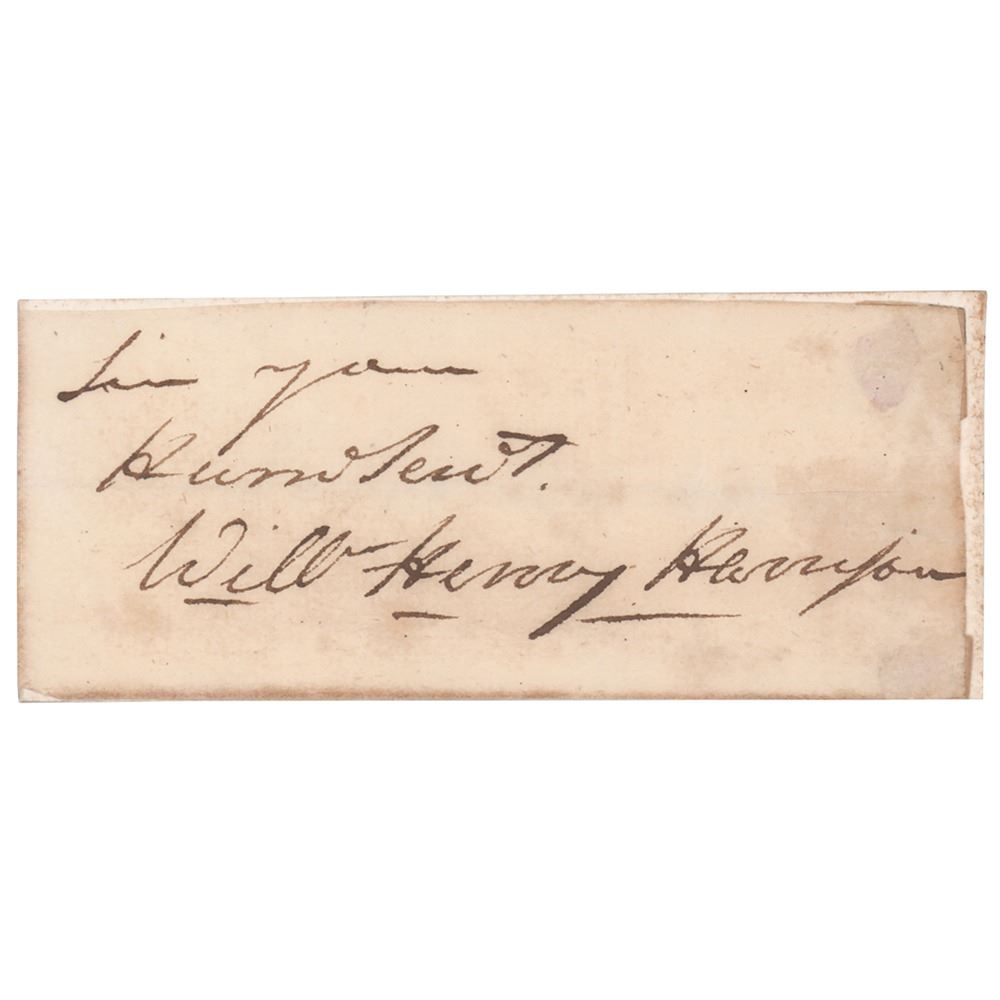 Ink signature, "Sir your Hum' Srv't, Will'm Henry Harrison,” on an off-white 3.75 x 1.5 sheet clipped from the close of a letter. Upper right corner of sheet is affixed to a same-size mount. In very good to fine condition, with light creasing and soiling. Accompanied by an engraving bearing a facsimile signature. A desirable autograph from the elusive ninth U.S. President.