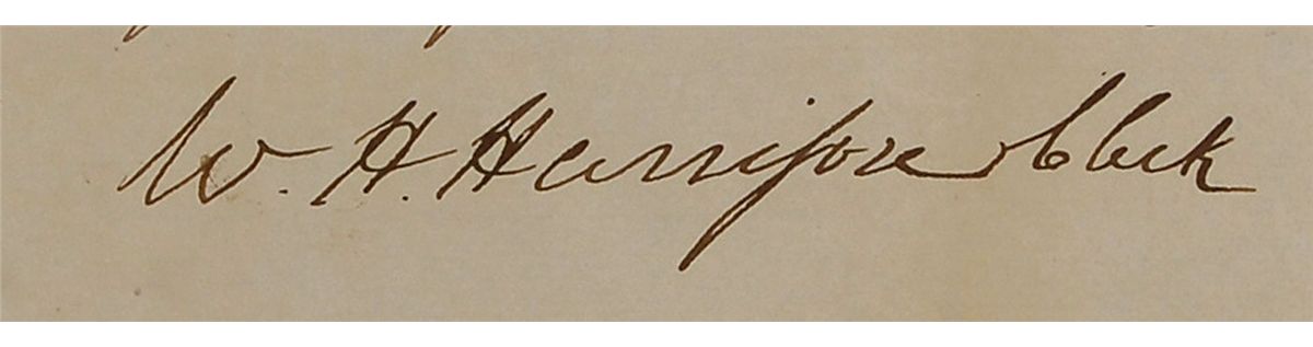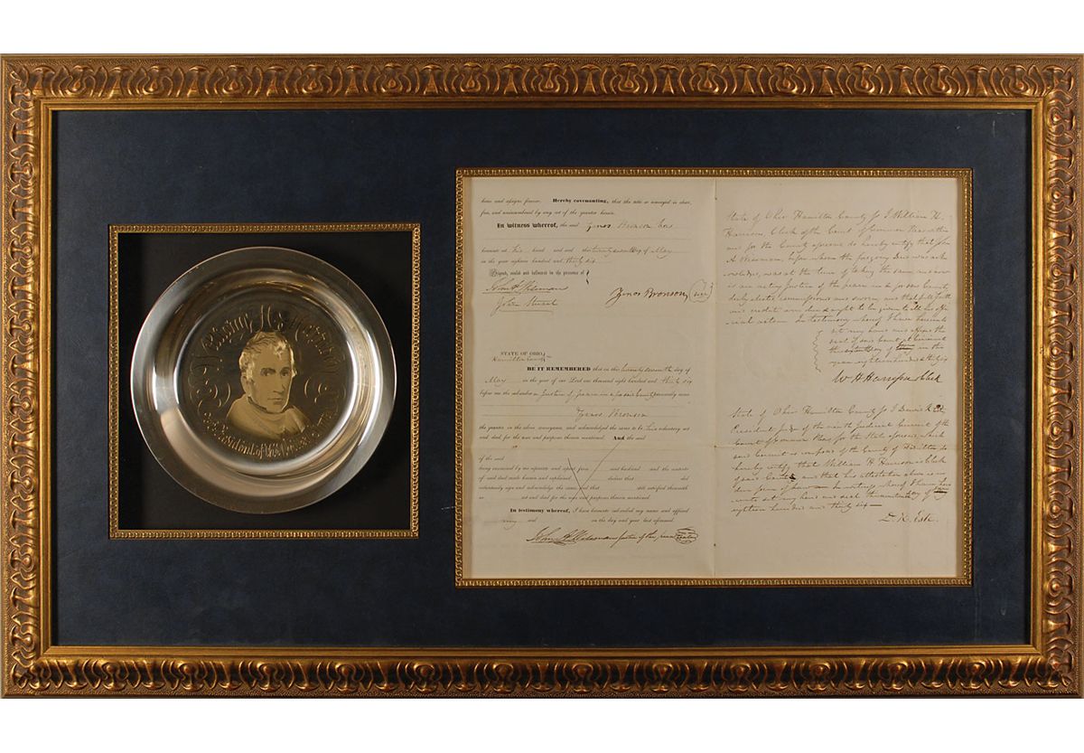 Bold ink endorsement, “W. H. Harrison, Clerk,” dated June 16, 1836, on the final page of a larger document. Document is three pages on two adjoined sheets, 7.25 x 12, concerning a land indenture between Zenos Bronson and David Bolles for $100. The endorsement, in an unknown hand, reads, in part: “I William H. Harrison, Clerk of the Court of Common Pleas…do hereby certify that John A. Wiseman, before whom the foregoing deed was acknowledged, was at the time of taking the same, and now is an acting Justice of the Peace in the foresaid county.” Attractively suede matted and framed with a a gold-inlaid, sterling silver portrait plate issued in a limited edition by the Franklin Mint in the early-to-mid 1970s to an overall size of 33 x 20. A couple light vertical wrinkles passing through the end of signature, some scattered mild toning, and three small binding holes along hinge, otherwise fine condition. Oversized.