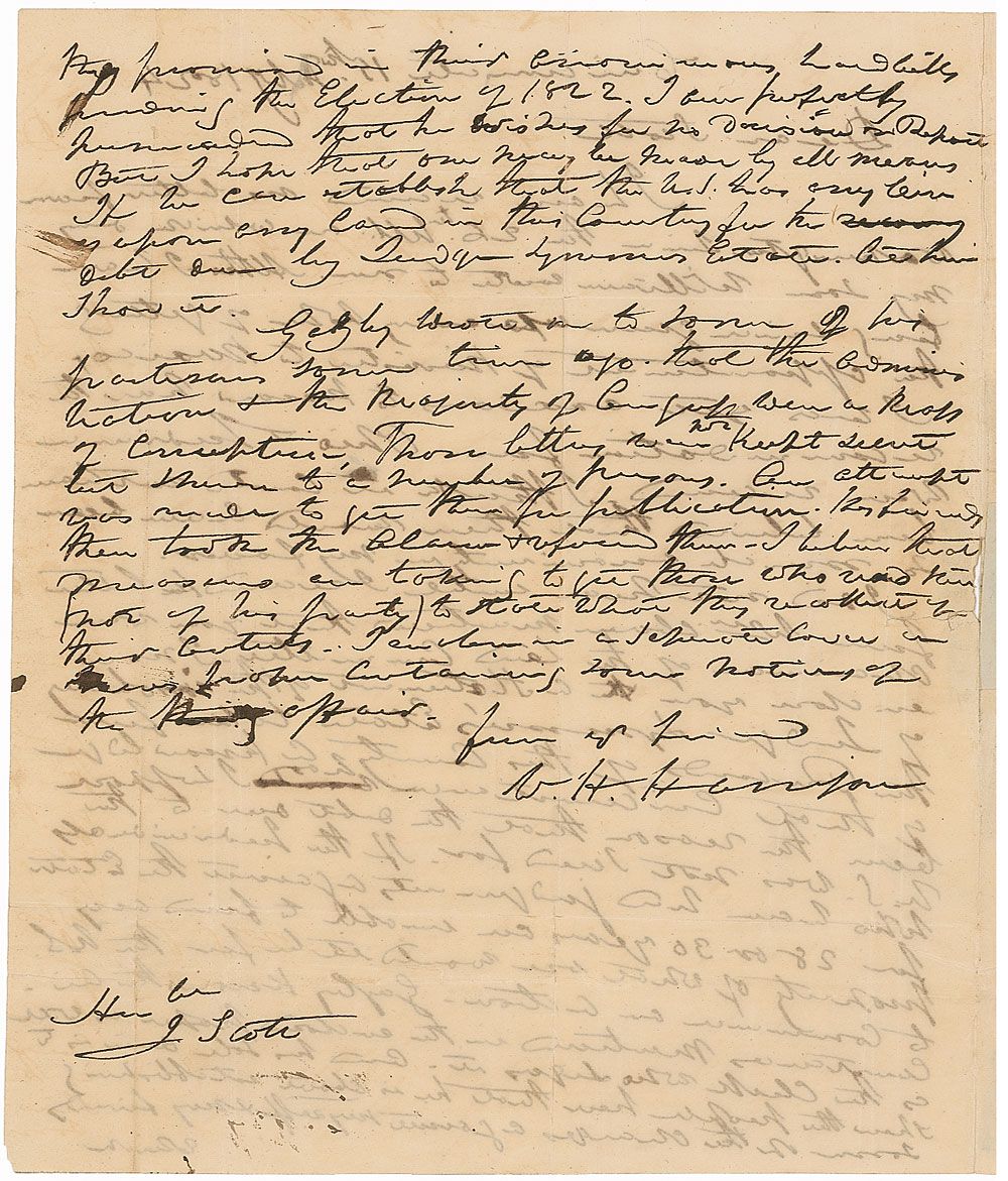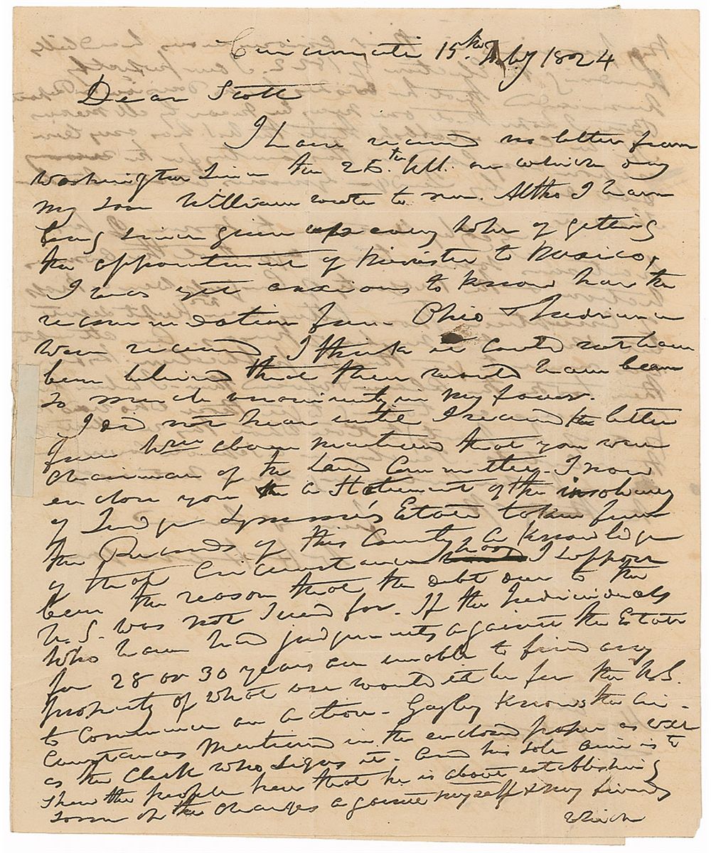 ALS signed “W. H. Harrison,” one page both sides, 8 x 9.75, Cincinnati, February 15, 1824. Letter to John Scott, congressman from Missouri. In part: "I have received no letter from Washington since the 25th ult. on which day my son William wrote to me. Altho I have long since given up every hope of getting the appointment of Minister to Mexico, I was yet anxious to know how the recommendation…was received. I think it could not have been believed that there would have been so much unanimity in my favor.