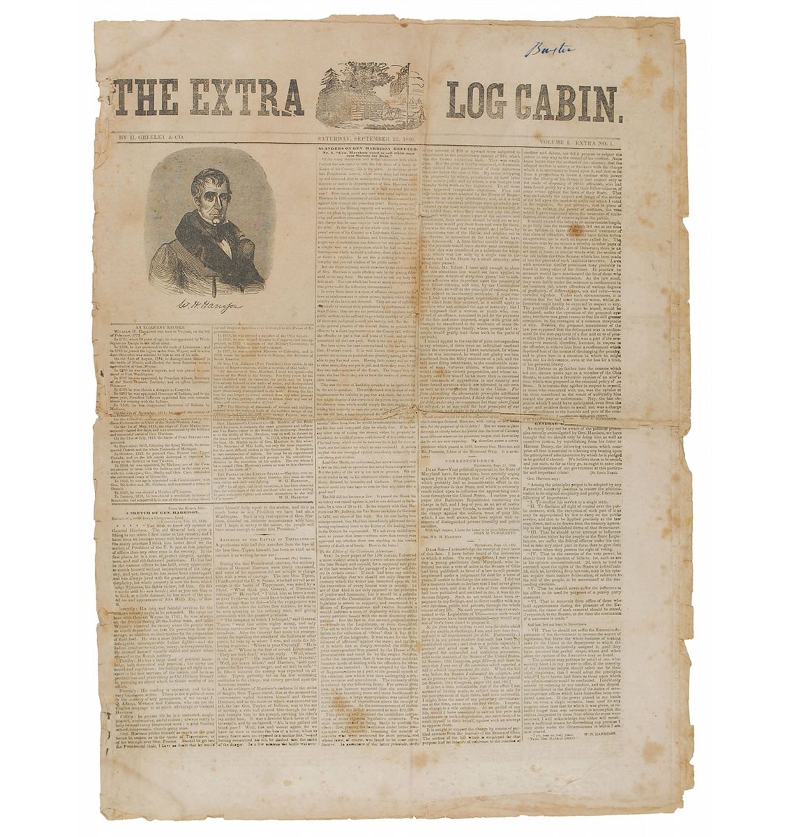 Rare original and complete issue of The Extra Log Cabin newspaper from September 12, 1840, eight pages, 15.5 x 21, published by Horace Greeley & Co. The entire newspaper is dedicated to the support of Harrison, featuring a wonderful engraved bust portrait of him on the front with his facsimile signature beneath, including over 30 articles about Harrison, many refuting claims of the Democratic opposition. Running against the incumbent Martin Van Buren, some column titles include: “Slanders of Gen. Harrison Refuted,” “Van Buren Economy!,” “The Orphan Wood-Chopper,” and “What Constitutes Greatness.” In very good condition, with intersecting folds, overall foxing, fraying to edges, various small tears and holes, and an ownership signature to the top of the front page. Greeley was a very influential newspaper publisher and also helped in Harrison’s ‘boots-on-the-ground’ campaign, organizing meetings, parades, and rallies in support of the Whig candidate.