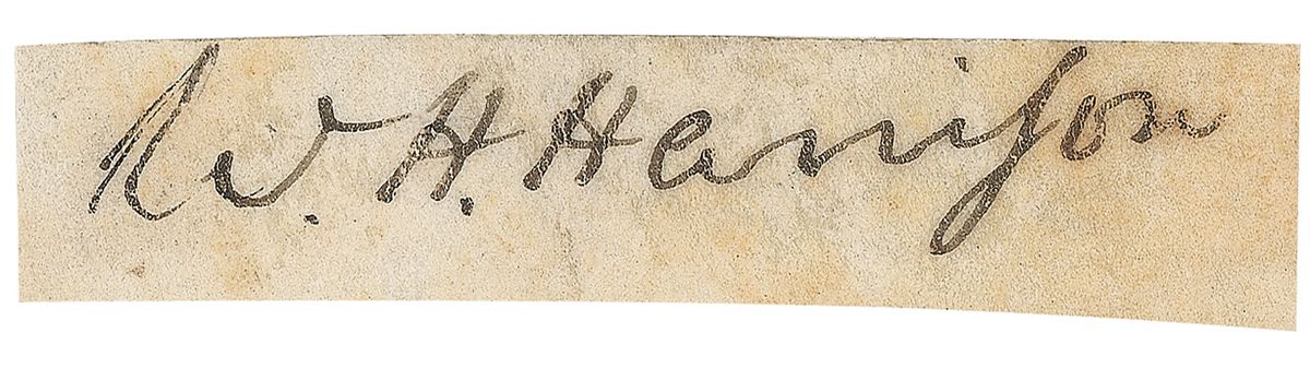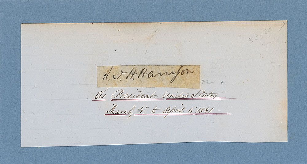 Excessively rare ink signature almost certainly as president, “W. H. Harrison,” on an off-white 2.25 x .5 vellum slip clipped from a larger document, affixed to a larger slip bearing a collector’s notation, which reads, “As President, United States. March 4 to April 4, 1841.” In fine condition. Though undated, the style of signature and the fact that it is on vellum are both indications that this was, as notated, signed during Harrison’s brief period as president. A choice example of this sought-after signature.