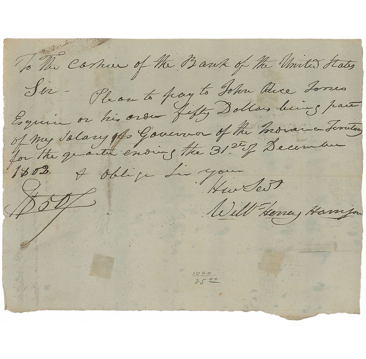 Very early ADS as governor, signed “Will’m Henry Harrison,” one page, 8 x 6, December 31, 1802. Harrison sends an instruction to “The Cashier of the Bank of the United States.” In full: “Please to pay to John Rice Jones Esquire or his order fifty Dollars being part of my salary as Governor of the Indiana Territory for the quarter ending the 31st of December 1802.” In very good condition, with some stray ink marks and brushing to the body of the document, four sets of thin cancellation cuts repaired with toned tape (two affecting the top two lines and two in the lower blank area), and a bit of show-through from docketing to reverse; nothing affects Harrison’s boldly penned signature, which is an ideal exemplar.