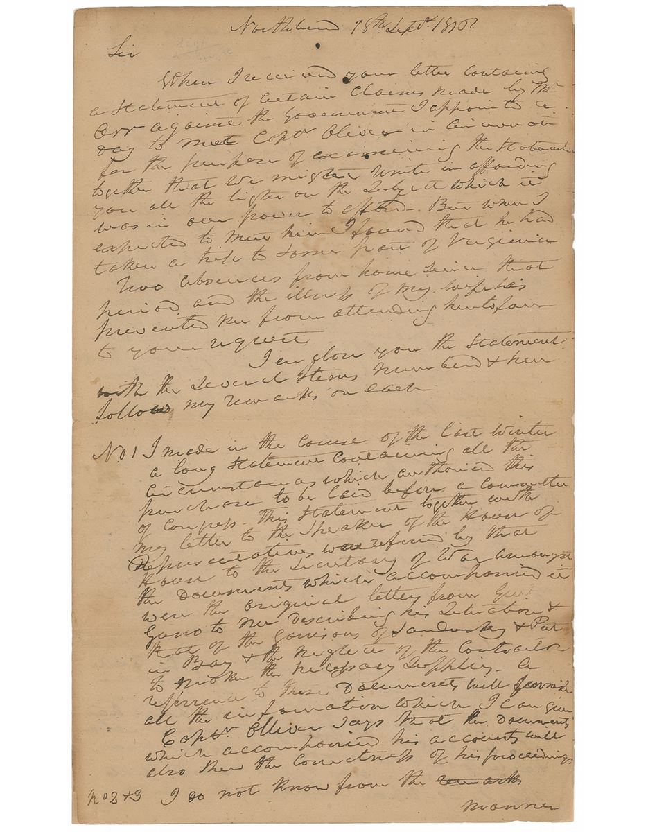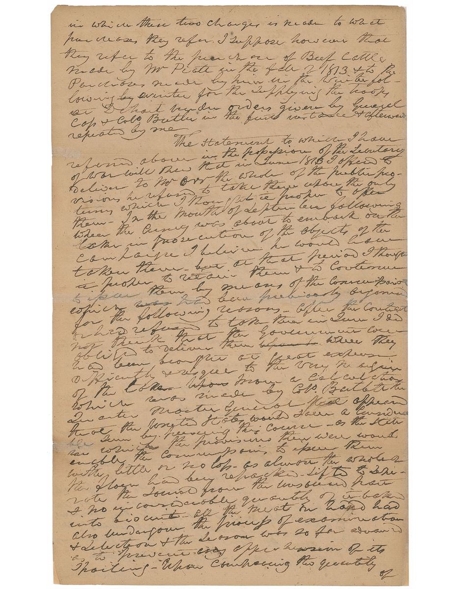 The march of the Army up the Thames was certainly rapid but I cannot conceive why it should be called Desultory.—the rear of the Army was safe & the Contractors proper I should suppose might have taken care of the Hides—Altho not within my own knowledge I think it very probable that beeves were often taken in the way here stated & the Hides lost to the Contractors…I shall be at Washington in December & will then settle the account and will also give any further information in my power on the subject of Mr. Orr's claims.” In very good condition, with intersecting folds (horizontal fold passing through the signature), some separations to folds expertly reinforced, and overall toning.