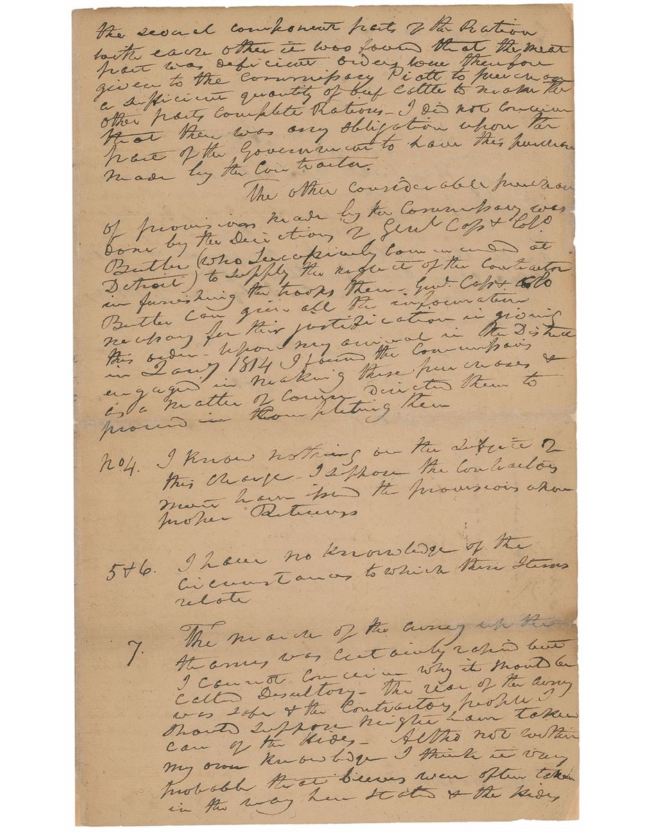 No 2 & 3 I do not know from the manner in which these two charges is made to what purchases they refer. I suppose however that they refer to the purchase of Beef Cattle made by Mr. Piatt in the fall of 1813 & to the Purchases made by him in the Winter following winter for the supplying the troops at Detroit under orders given by General Cass & Colo Butler in the first instance & afterwards repeated by me…in June 1813 I offered to deliver to Mr. Orr the whole of the public provisions, he refused to take them upon the only terms which I thought proper to offer them…
