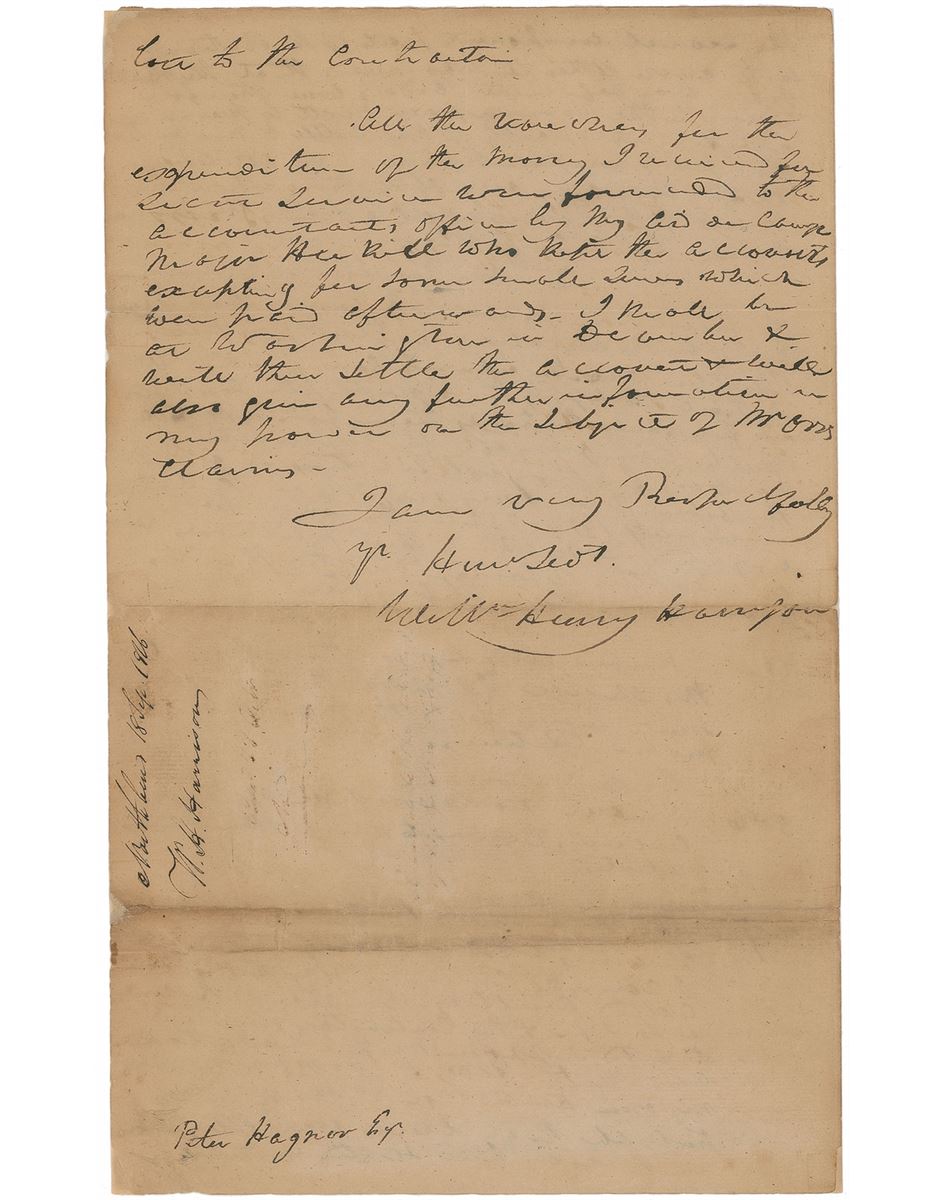 ALS signed “Willm Henry Harrison,” four pages on two adjoining sheets, 7.5 x 12.5, September 18, 1816. Letter to Peter Hagner, in part: “When I received your letter containing a Statement of Certain Claims made by Mr. Orr against the Government I appointed a day to meet Capt. Oliver in Cincinnati for the purpose of examining the statements together that we might write in affording you all the light on the Subject which it was in our power to afford. But when I expected to meet him, I found that he had taken a trip…I enclose you the statement with the several items numbered & here follow my remarks on each.