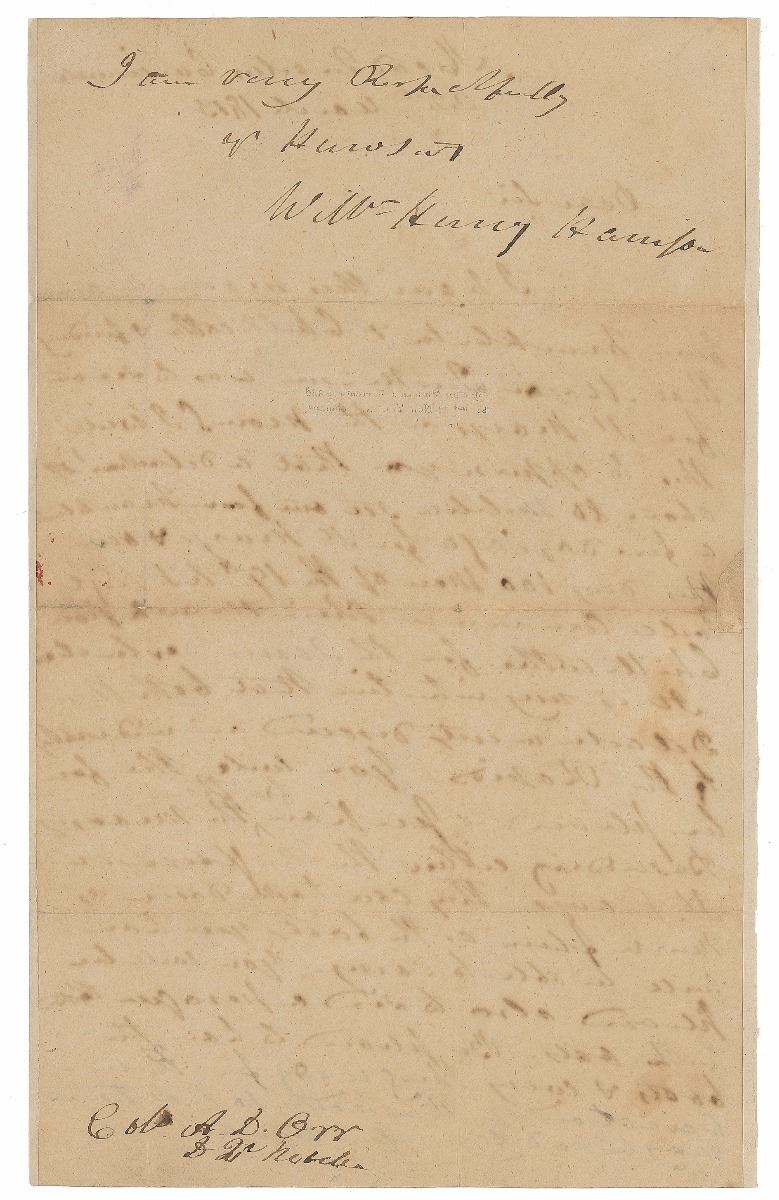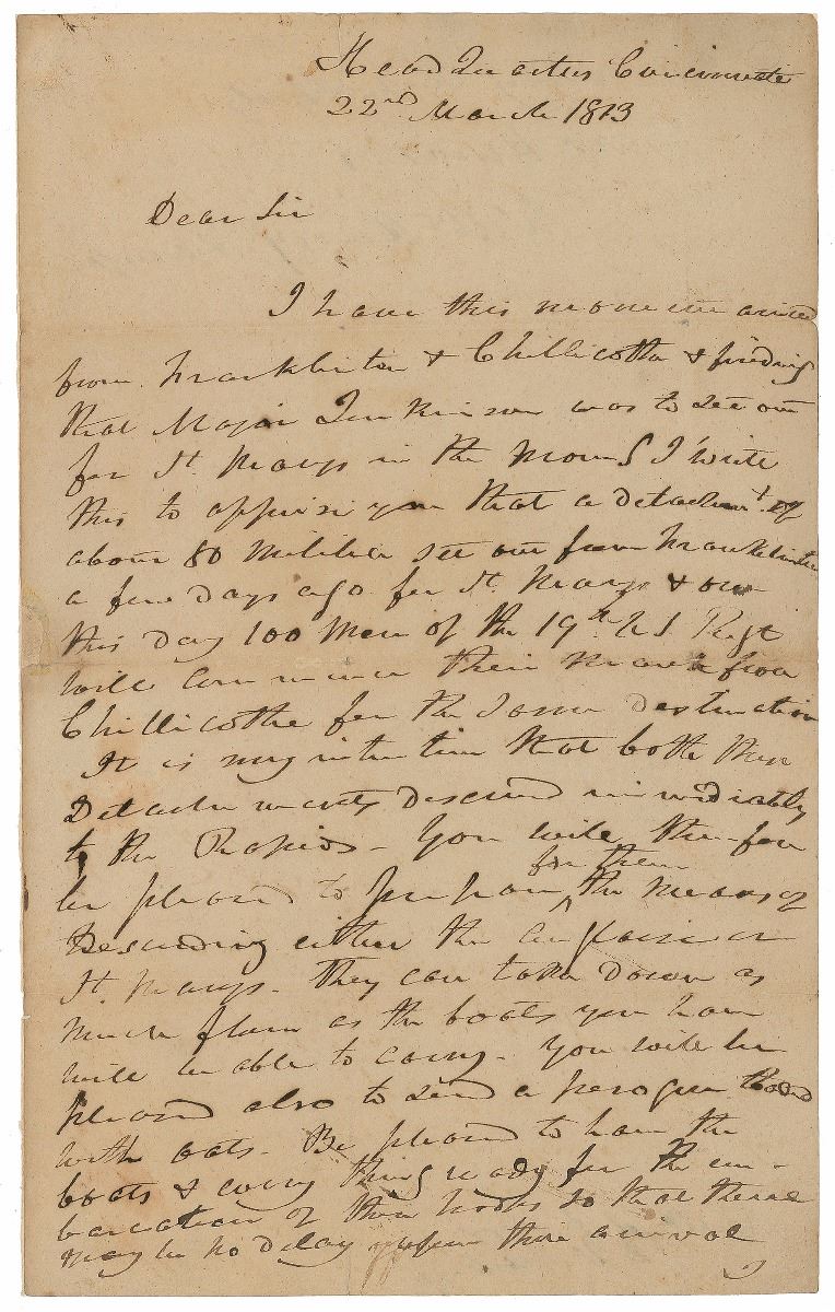 War-dated ALS signed “Willm. Henry Harrison,” one page, 7.75 x 12.5, March 22, 1813. Harrison writes from Headquarters, Cincinnati, to Colonel A. D. Orr. In part: “I have…arrived from Franklinton & Chillicothe & finding that Major Jenkinson was to set out for St. Mary's I write this to apprise you that a detachment of about 80 militia set out from Franklinton a few days ago for St. Mary's & out this day 100 men of the 19th U.S. Regt. will commence…from Chillicothe for the same destination. It is my intention that both these detachments descend…to the Rapids. You will therefore be pleased to prepare for them the means of descending…They can take down as much…as the boats you have will be able to carry.” Intersecting folds, scattered toning, a small area of professionally repaired paper loss to left edge, and thin mounting strips to edges of reverse, otherwise fine condition. At this time, Harrison was serving as a general in the War of 1812; later on in 1813 he would lead his men to a decisive victory at the Battle of the Thames, reestablishing American control over the Northwest frontier.