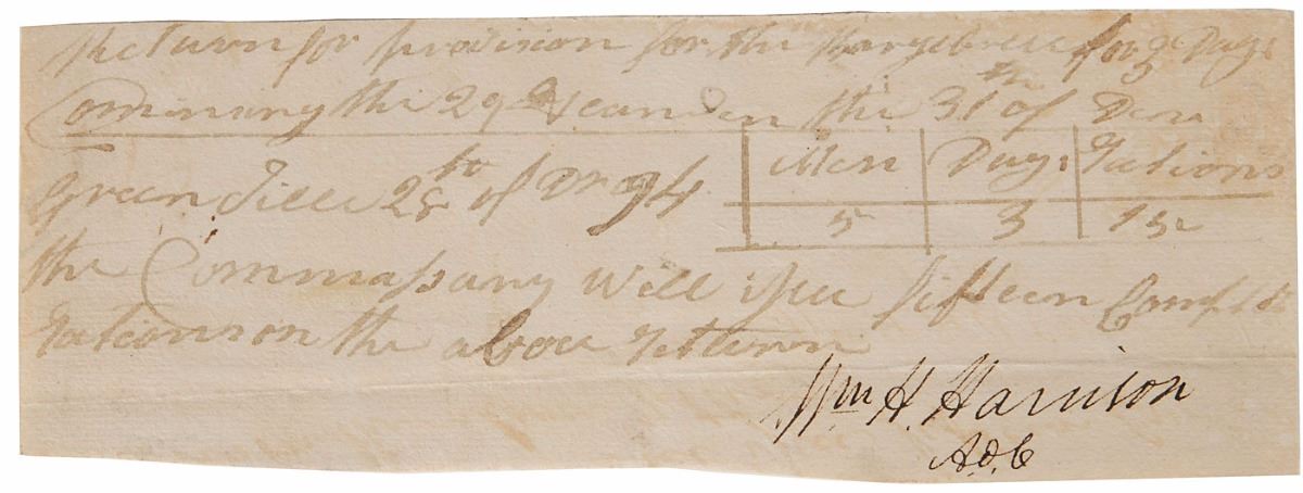 Manuscript DS, signed “Wm. H. Harrison, A.D.C.,” one page, 8 x 2.75, December 28, 1794. Return for provisions issued at Greenville, denoting fifteen rations for five men over a three-day period. Crisply signed at the conclusion by the 21-year-old Harrison as aide-de-camp to General ‘Mad Anthony’ Wayne. In fine condition.