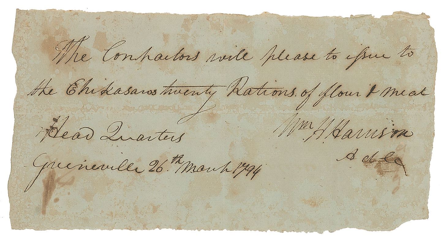ADS, signed “Wm. H. Harrison, A d C,” one page, 8.25 x 4.25, March 26, 1794. A food supply order issued from "Headquarters" in Greenville, Ohio, in full: "The Contractors will please to issue to the Chikasaws twenty Rations of flour & meat." In very good to fine condition, with somewhat irregular overall staining.